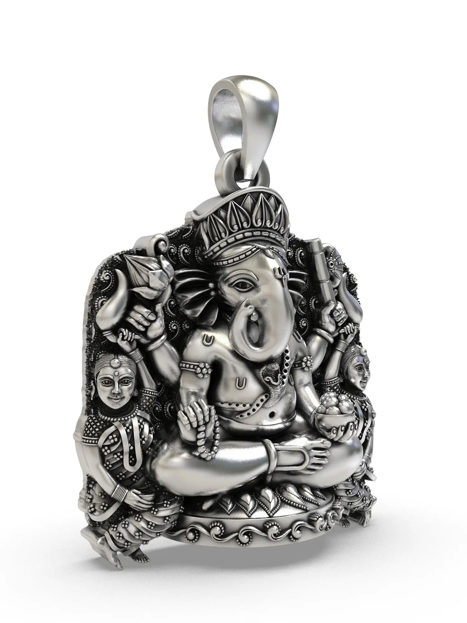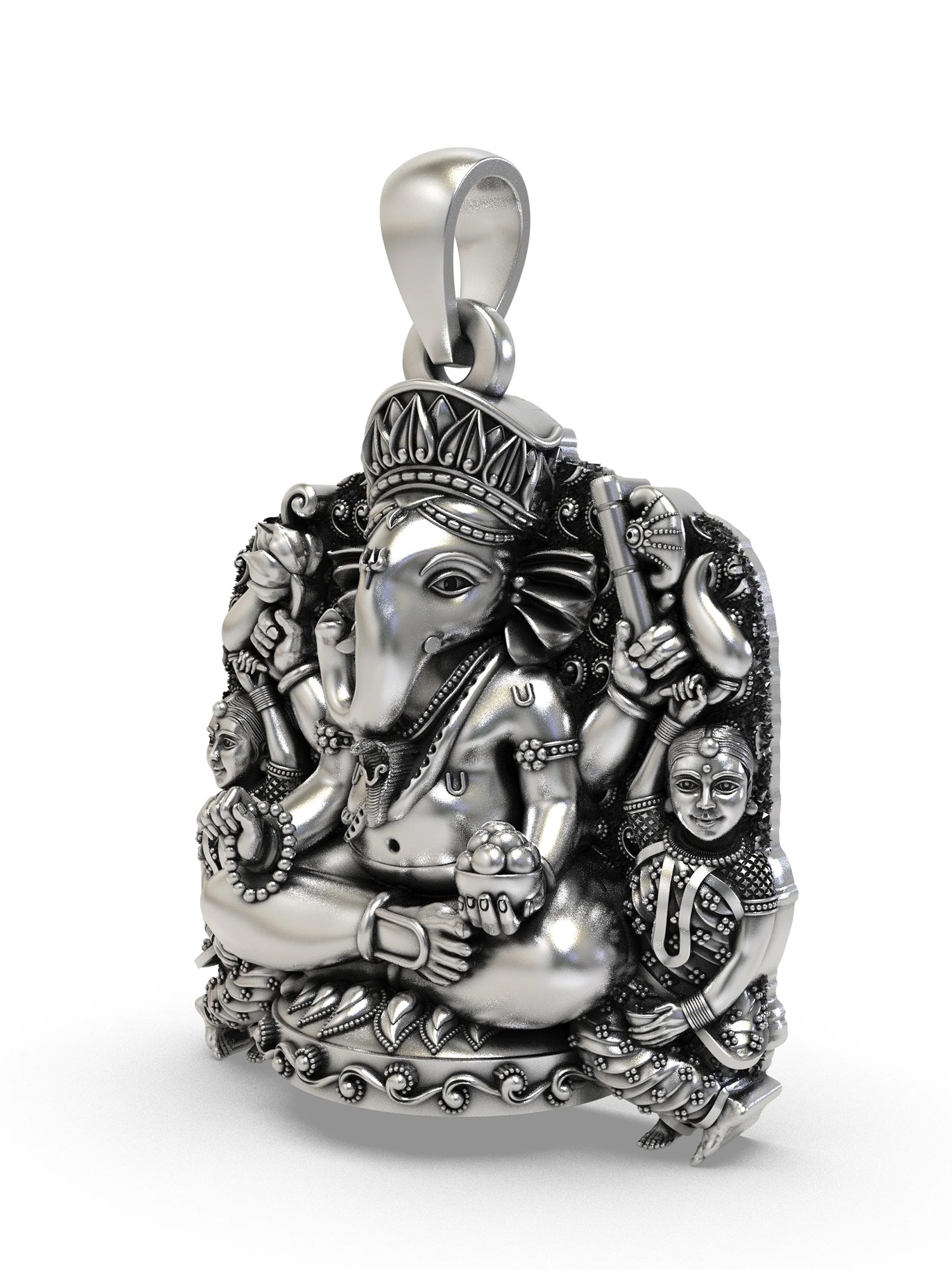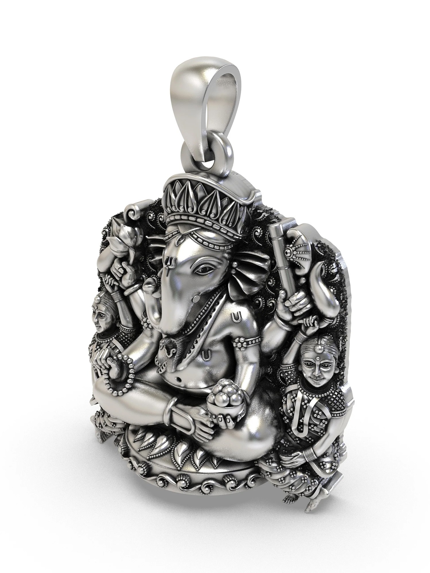 The centerpiece of this pendant is a beautifully sculpted Lord Ganesha, seated serenely and radiating an aura of peace and power. His iconic form, with the gentle curve of his trunk and the wise expression on his face, is brought to life in gleaming sterling silver. He holds symbolic objects in his multiple hands, each carrying profound meaning – a lotus representing purity and enlightenment, and modaks signifying the sweetness of spiritual reward. Flanking him are two figures, adding to the narrative and visual richness of the design. The intricate crown atop his head and the detailed ornamentation he wears showcase the artisan's dedication to capturing every nuance of this sacred iconography.