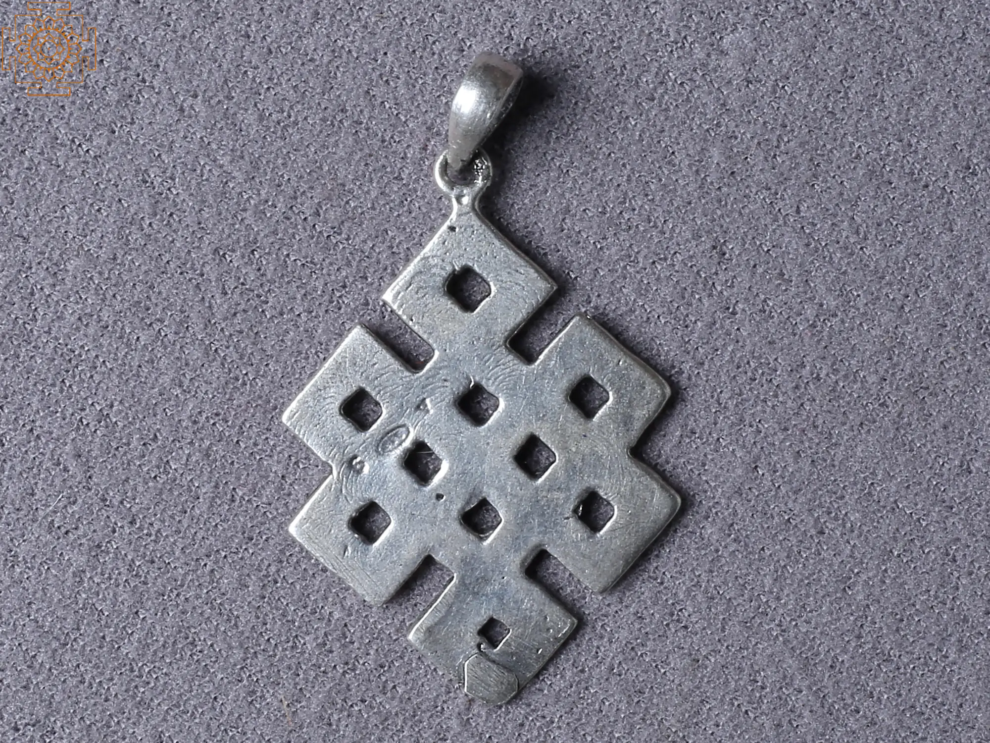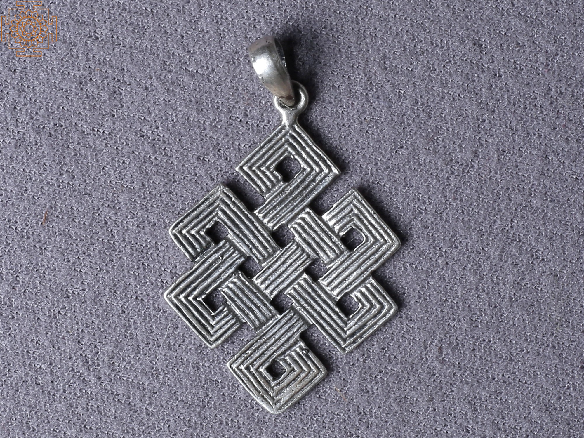 The Boundless Knot or Endless Knot is a sacred symbol in Buddhism. It is one of the symbols included in the Ashtamangala, the offerings made by the deities to the Shakyamuni when he attained enlightenment. This Boundless Knot pendant is an accessory that brings the auspiciousness of the symbol close to the heart of the beholder. The use of silver another sacred metal increases the goodness of the pendant and makes it a perfect daily wear jewelry piece.