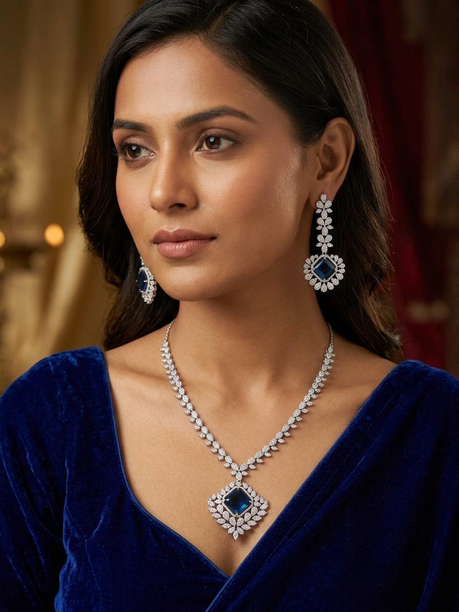Silver-Tone Stone Studded Elegant American Diamond Necklace Set With Earrings