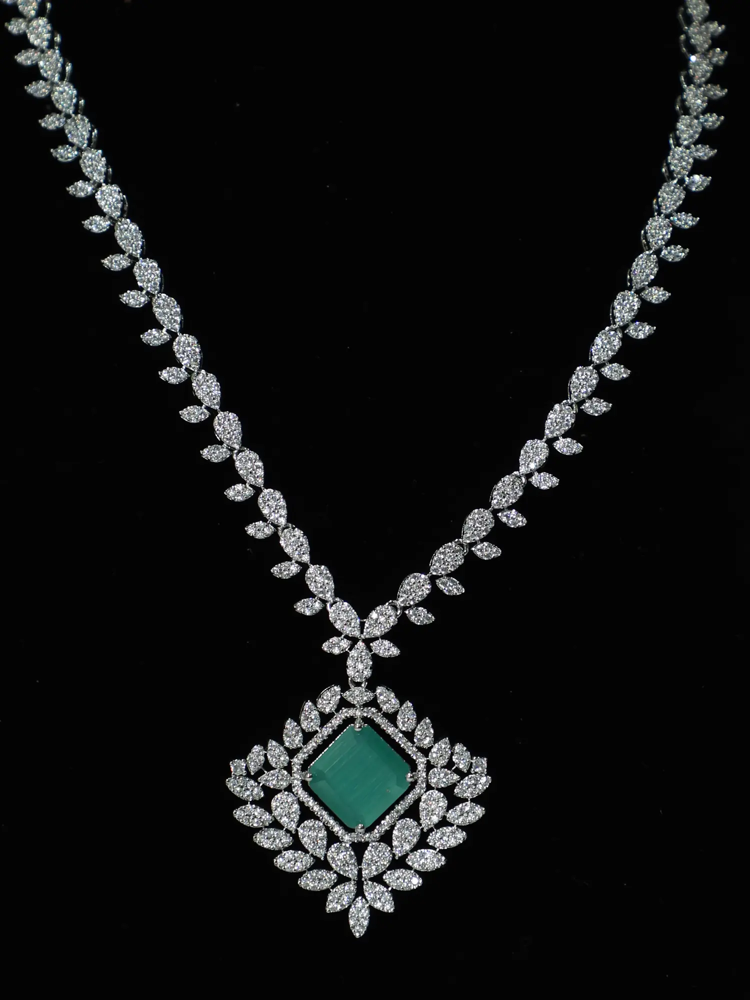 Exquisite Silver Tone Leaf Design American Diamond Necklace Set With Earrings