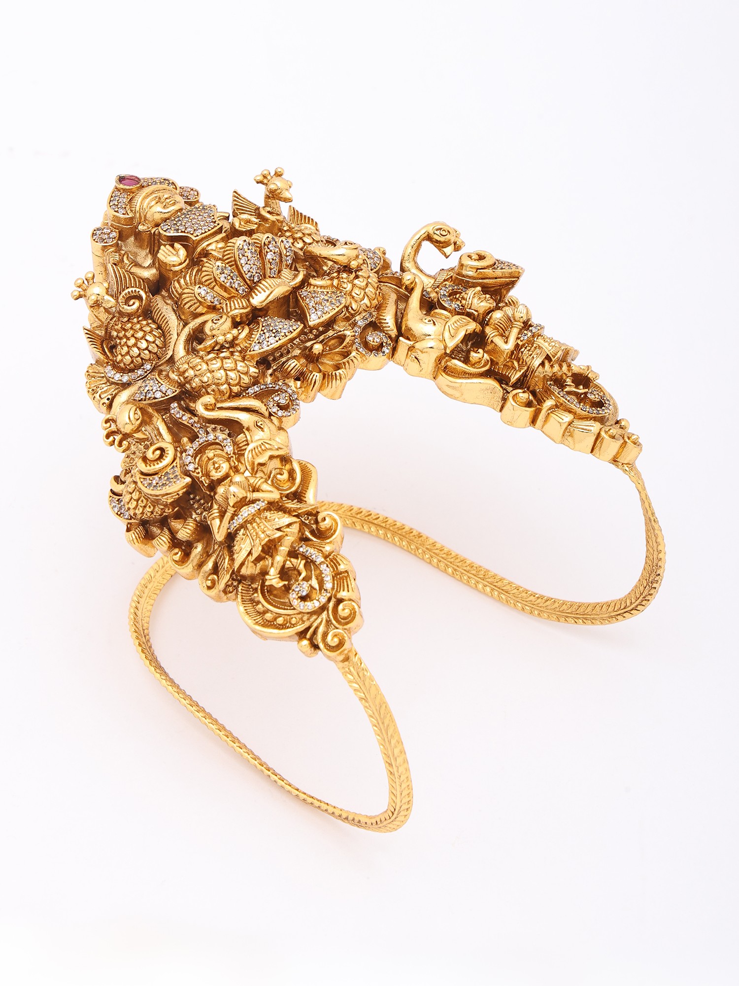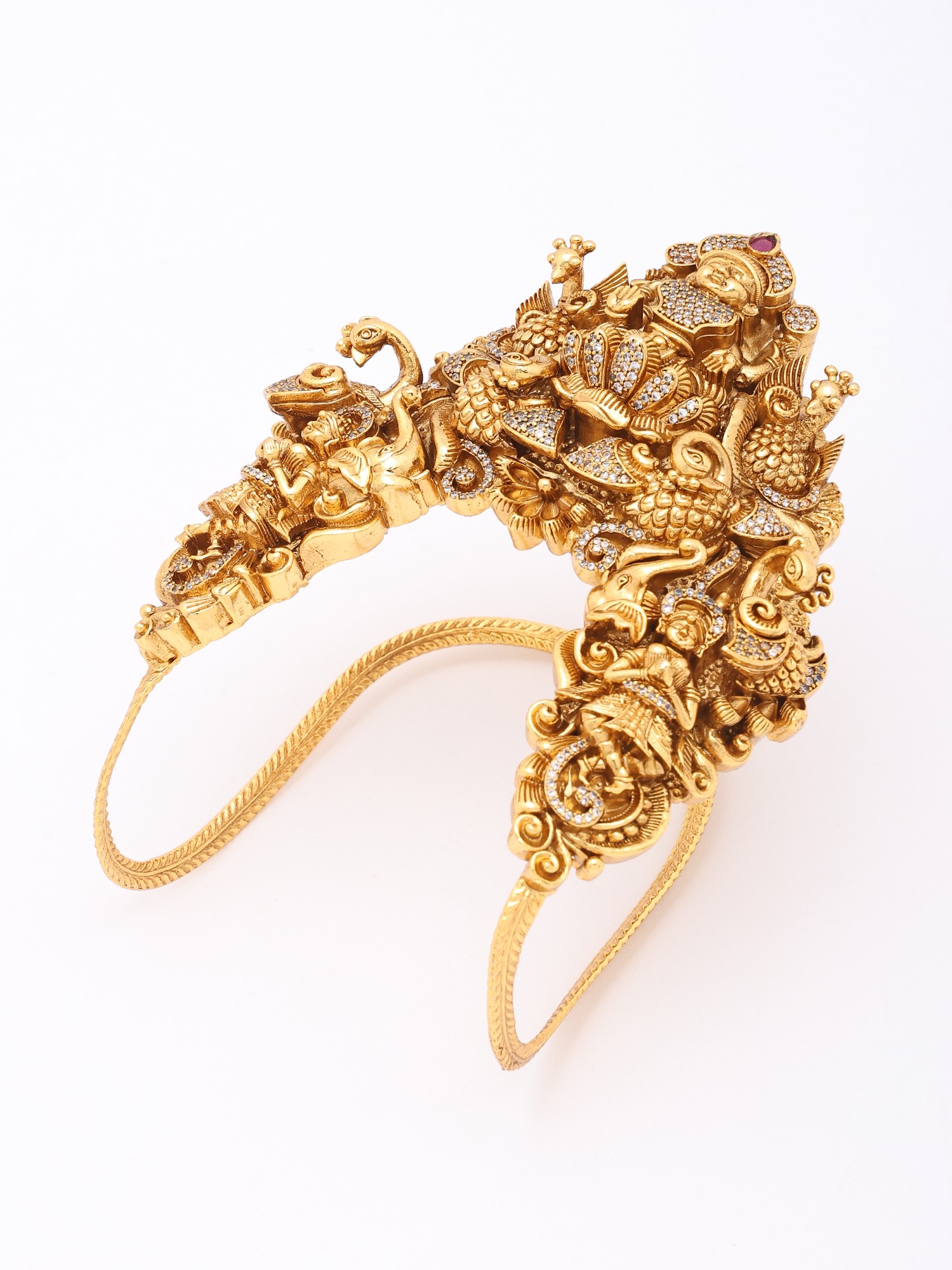 This design draws inspiration from the revered traditions of South India, where such ornate embellishments have graced royalty and deities for centuries. It embodies a rich cultural narrative, connecting you to a lineage of artistry and spiritual significance. Wearing this piece is like wearing a piece of history, imbued with the blessings and stories of generations past.