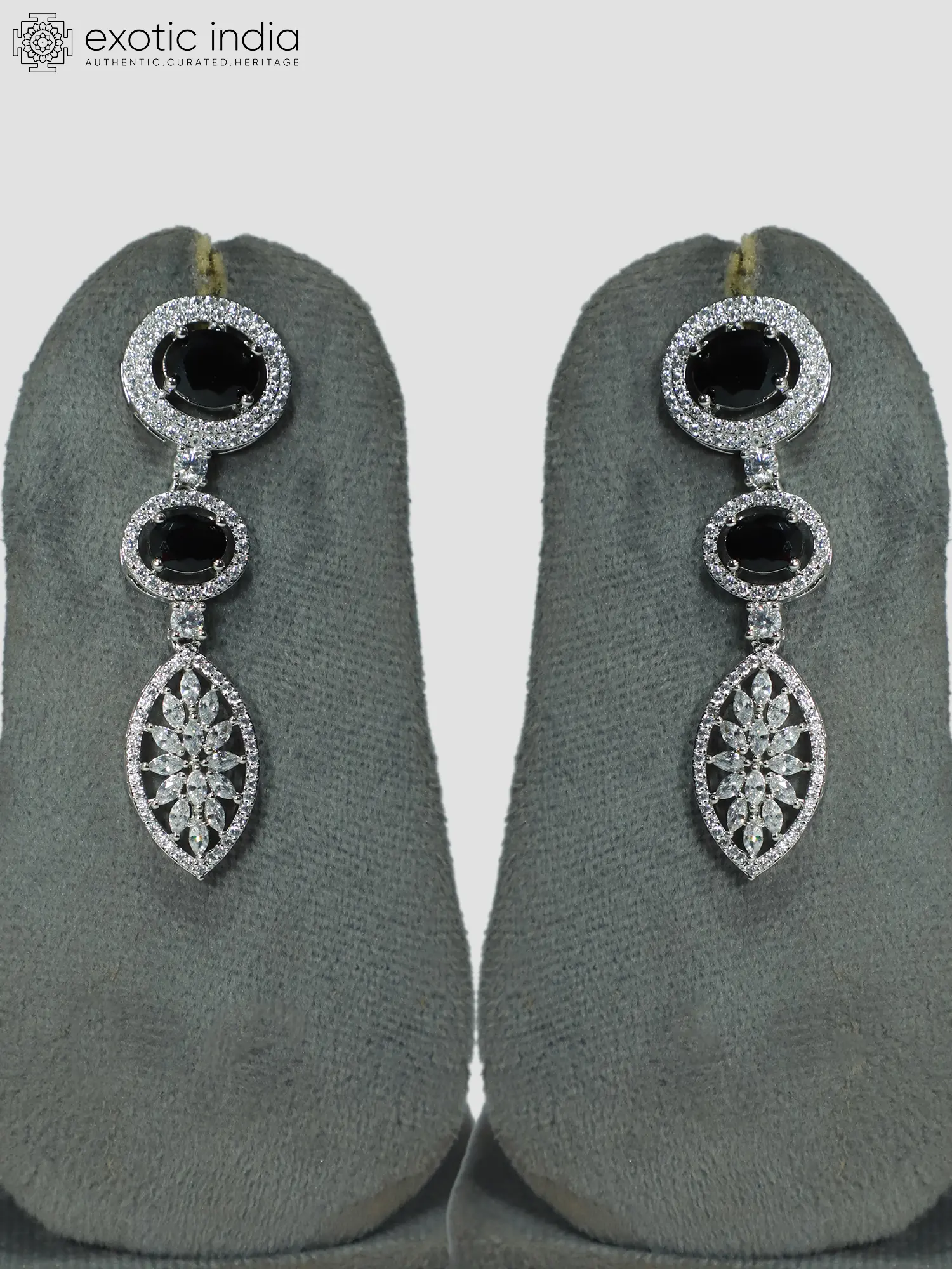 Features a striking necklace and complementary dangle earrings, both adorned with brilliant cubic zirconia stones.