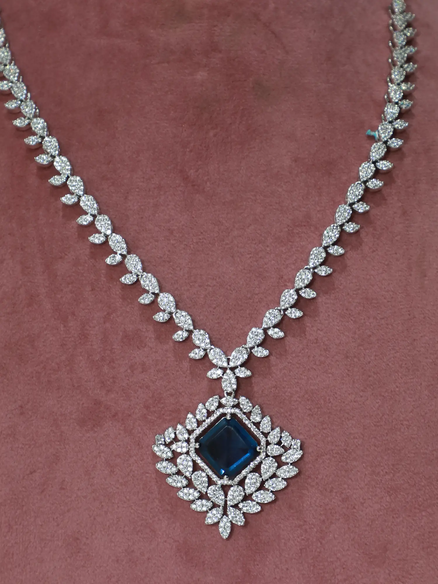 The necklace chain is embellished with delicate leaf-shaped motifs adorned with small cubic zirconia stones.