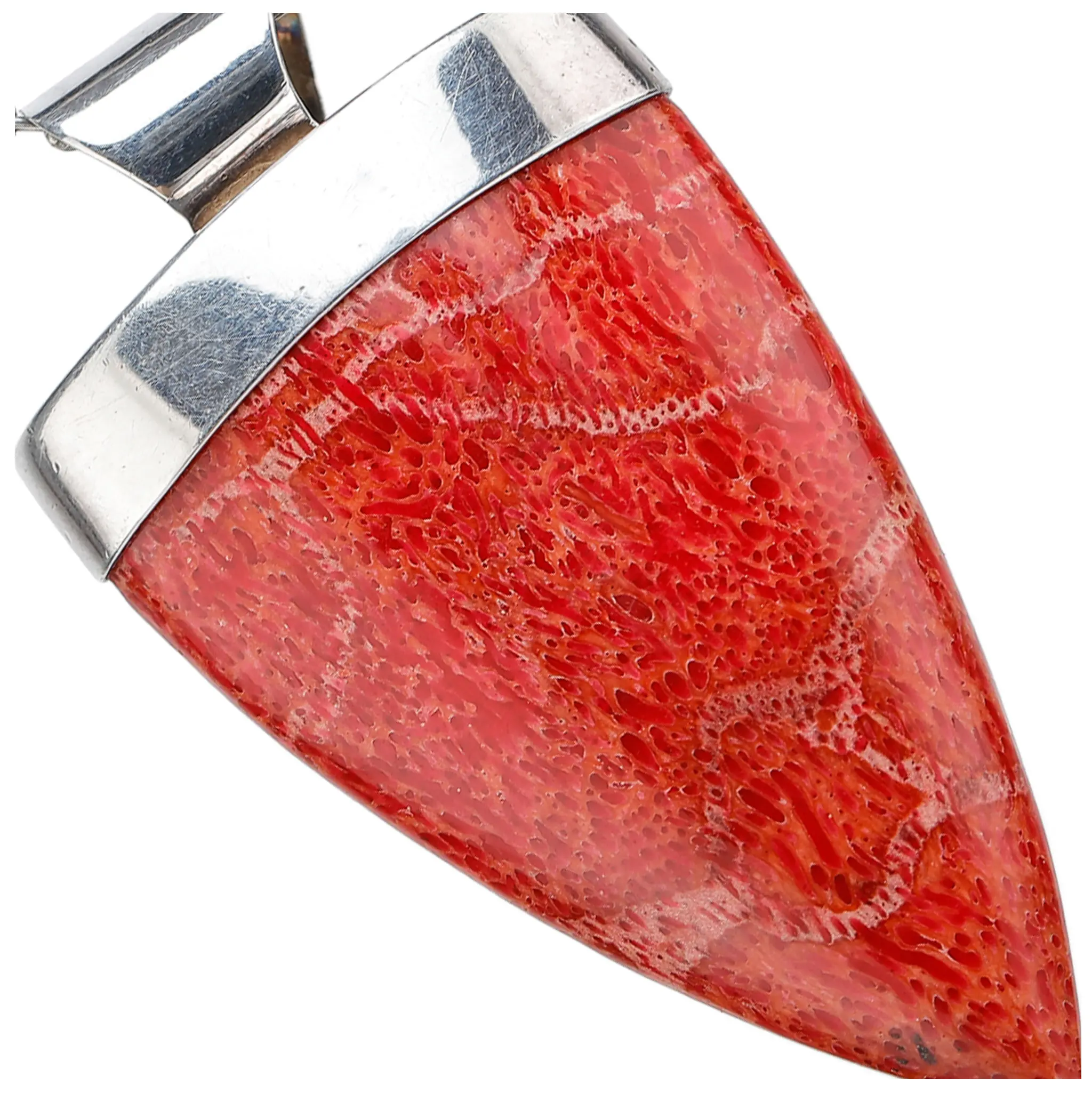 Discover a piece of the sea's captivating beauty captured in this exquisite pendant. Crafted with meticulous attention to detail, this pendant features a stunning piece of natural sponge coral, its vibrant red hues evoking the warmth and energy of a sun-drenched coral reef. The unique porous texture of the sponge coral creates a mesmerizing, organic pattern that is truly one-of-a-kind. Each opening and crevice tells a story of the ocean's deep, mysterious depths, making this pendant a conversation starter and a wearable work of art. The rich, fiery tones of the coral are artfully encased in a sleek, polished sterling silver setting. The silver provides a cool, sophisticated contrast to the warm vibrancy of the coral, highlighting its natural beauty. The pendant is designed in a graceful pointed oval shape, offering a modern yet timeless silhouette that drapes elegantly. The smooth, substantial feel of the sterling silver, combined with the intricate texture of the coral, creates a tactile and visually appealing experience.
