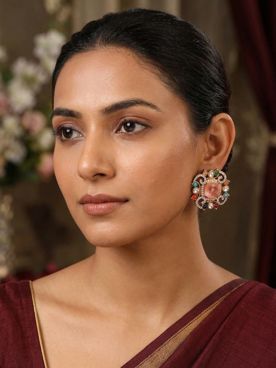 These stunning square-shaped earrings are a masterpiece of intricate design and vibrant color. Each earring features a captivating central pink stone, elegantly framed by a delicate gold filigree setting. The intricate swirls and curves of the design are meticulously crafted, adding a touch of sophistication to any outfit. The surrounding stones, in a variety of colors, including turquoise, coral, and emerald, create a kaleidoscope of brilliance that catches the light with every movement. This delightful array of colors complements the central pink stone, resulting in a beautiful harmony of shades. These earrings are more than just an accessory; they’re a statement piece that elevates your style.