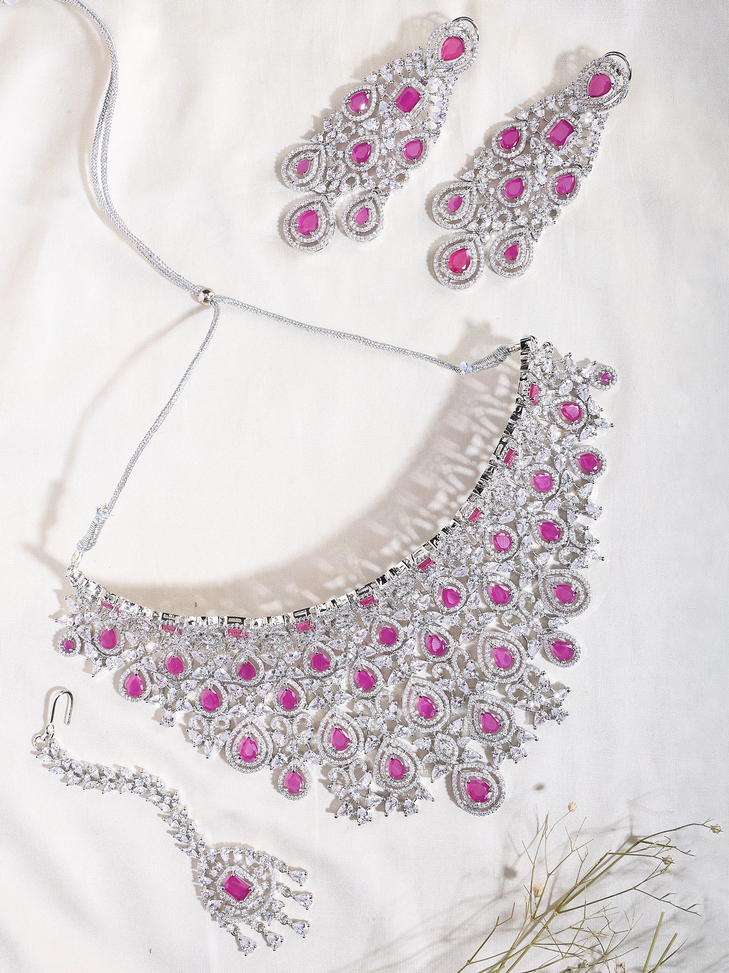 Teardrop American Diamond Bridal Necklace Set with Maang Tikka