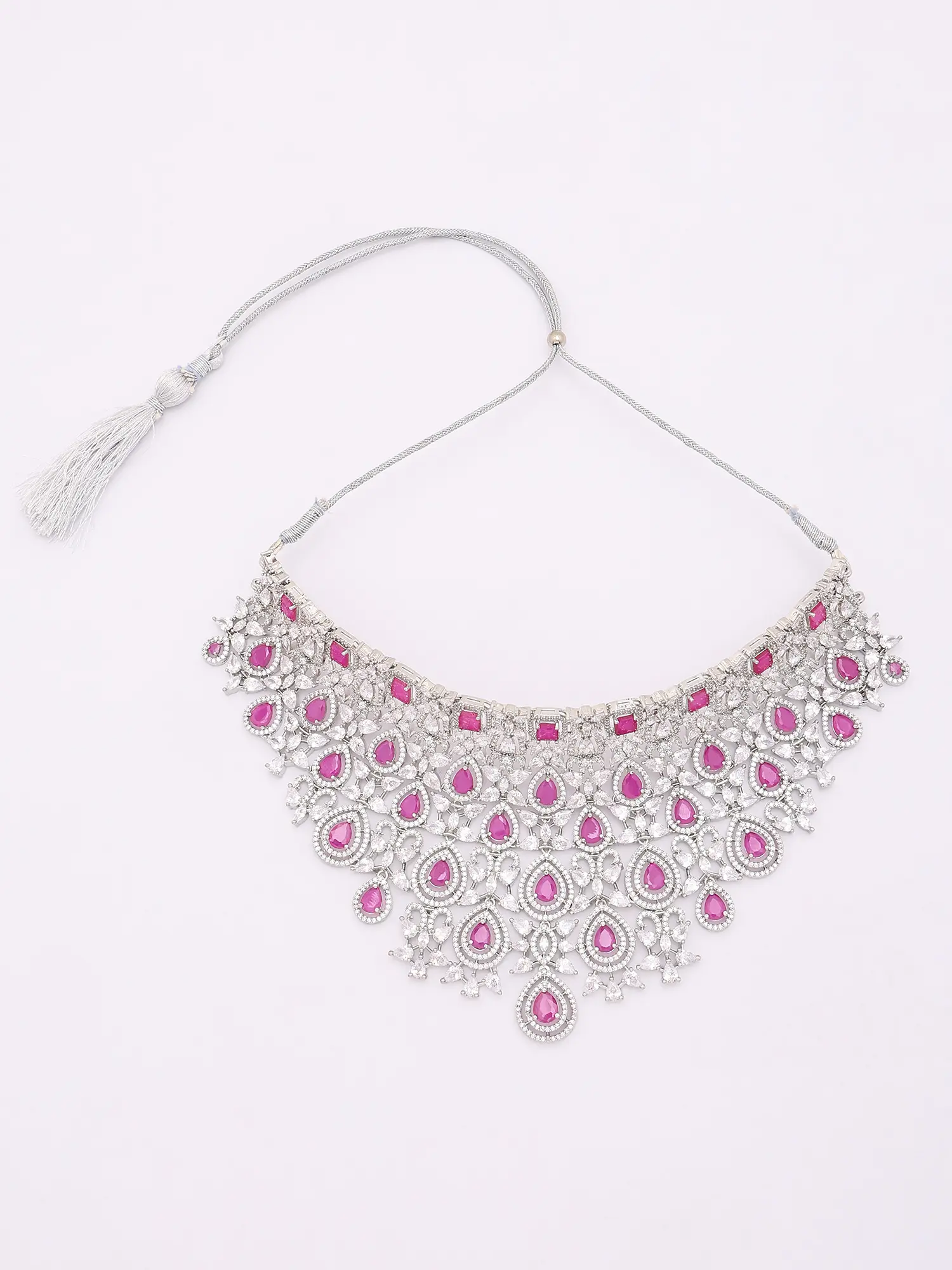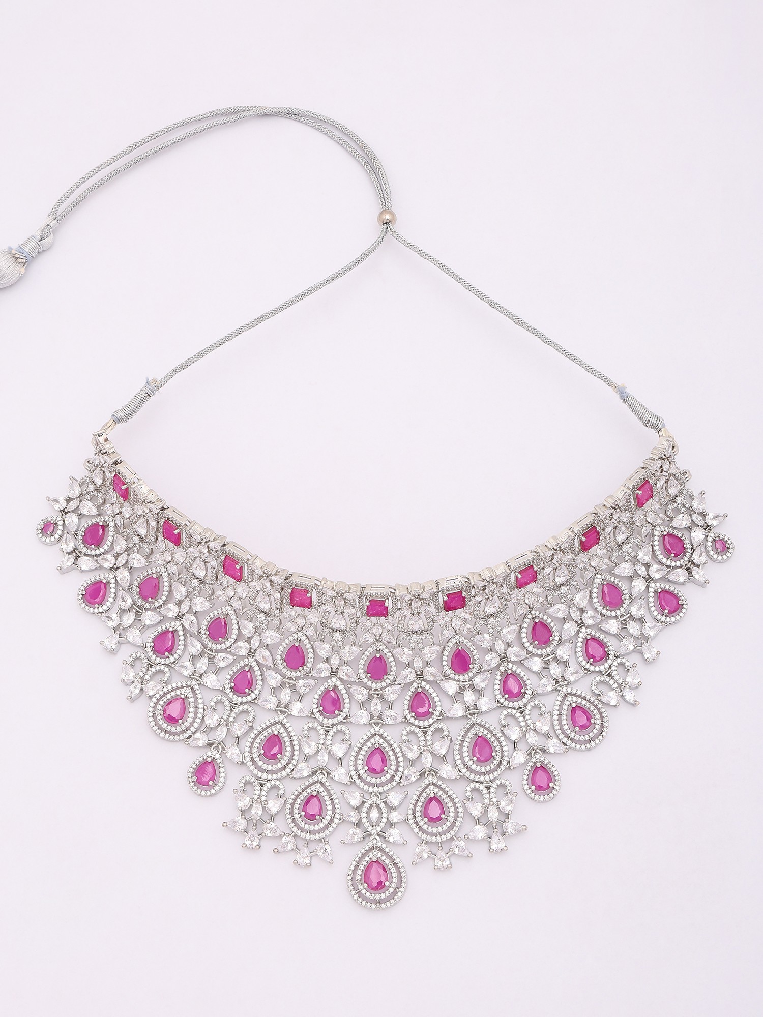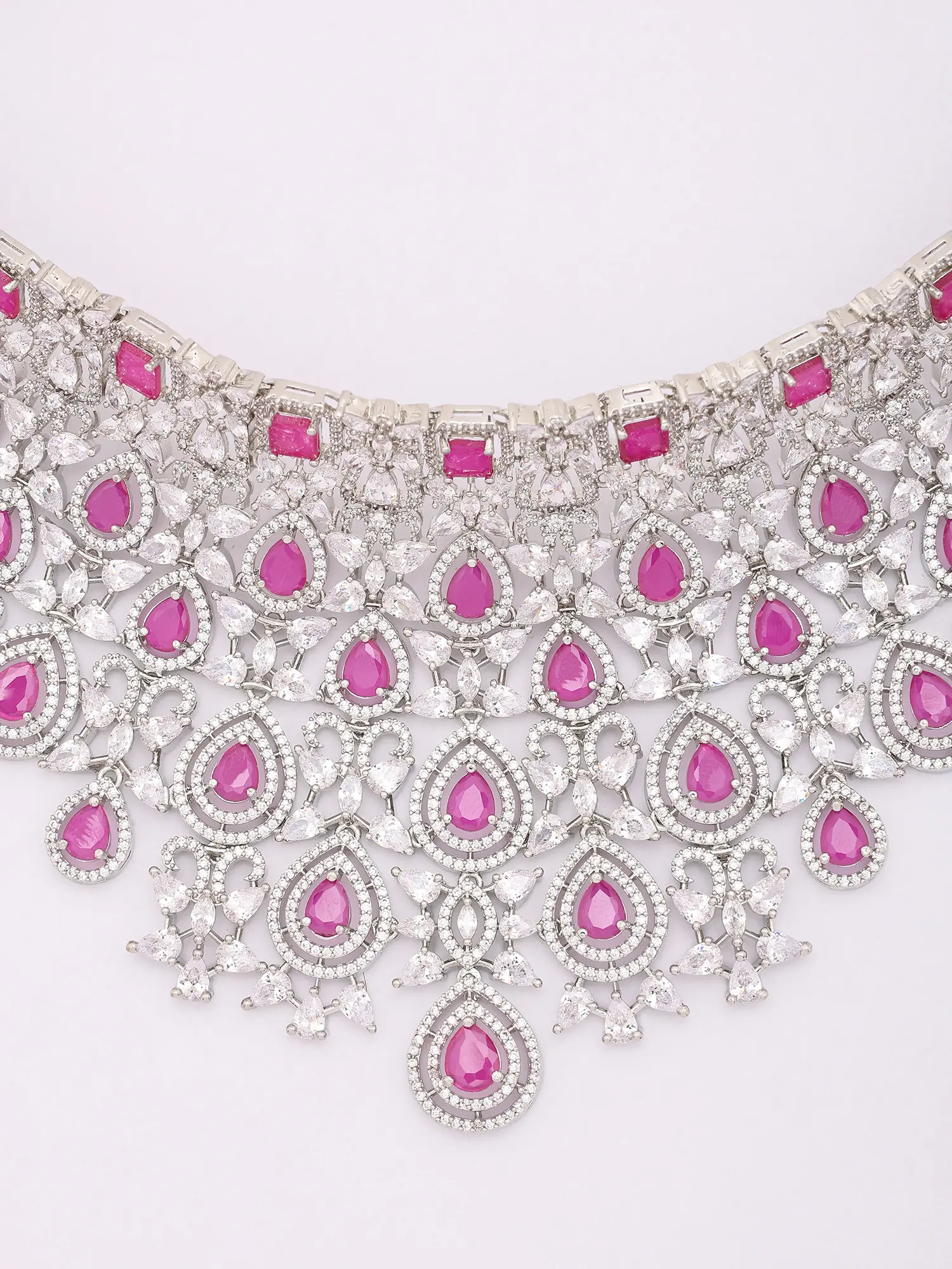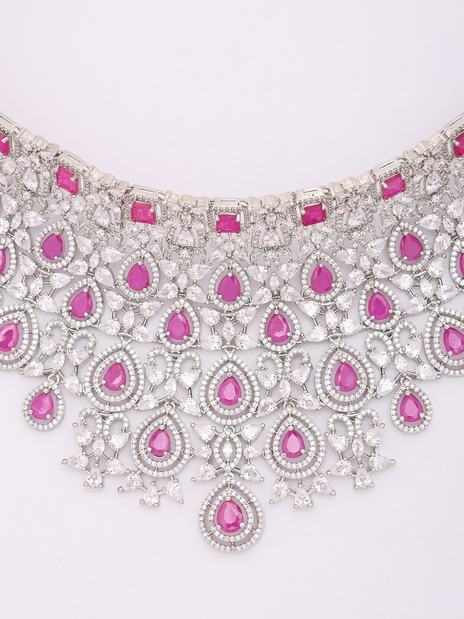Features a striking necklace adorned with brilliant pink stones and clear cubic zirconia.
