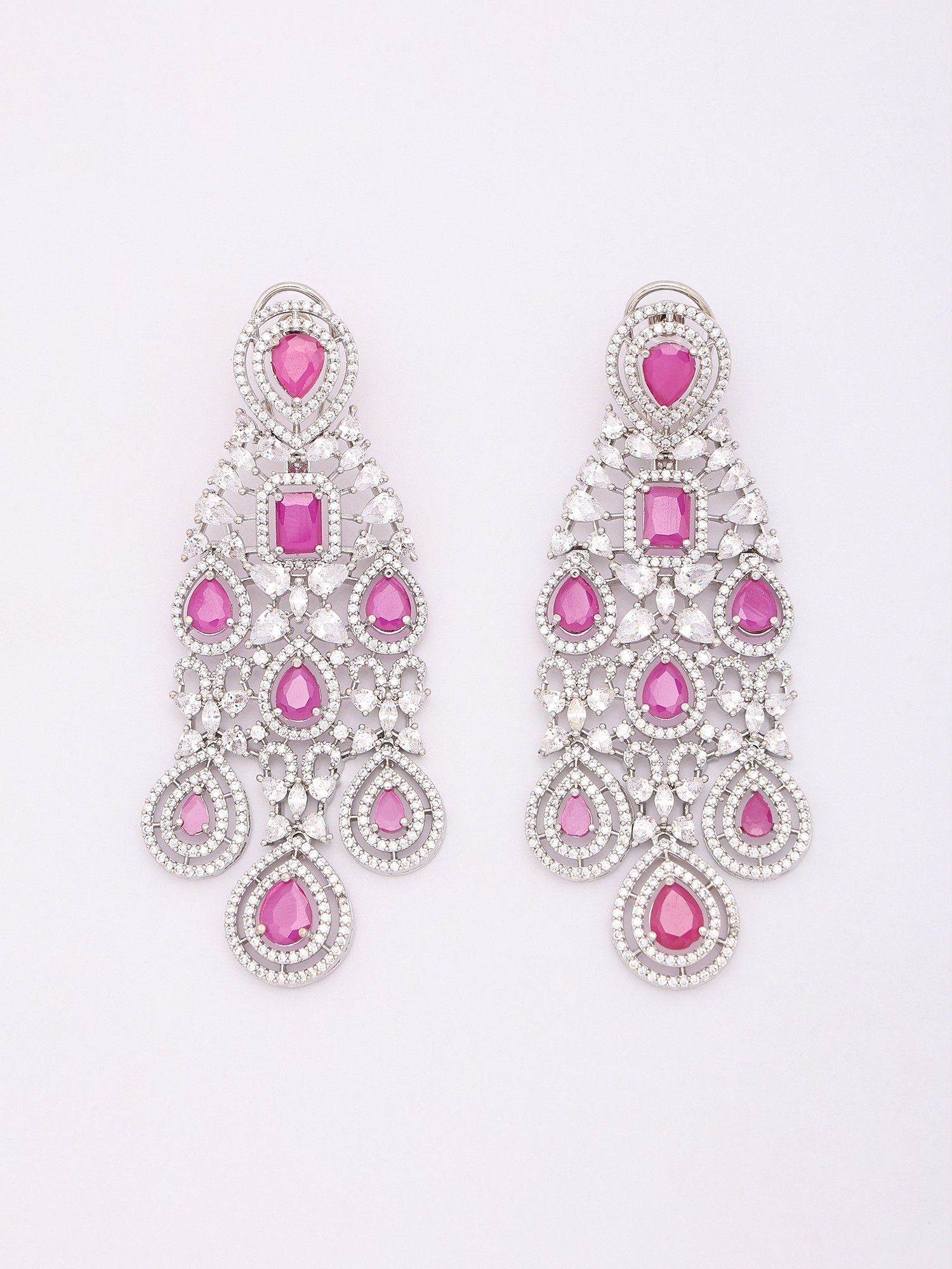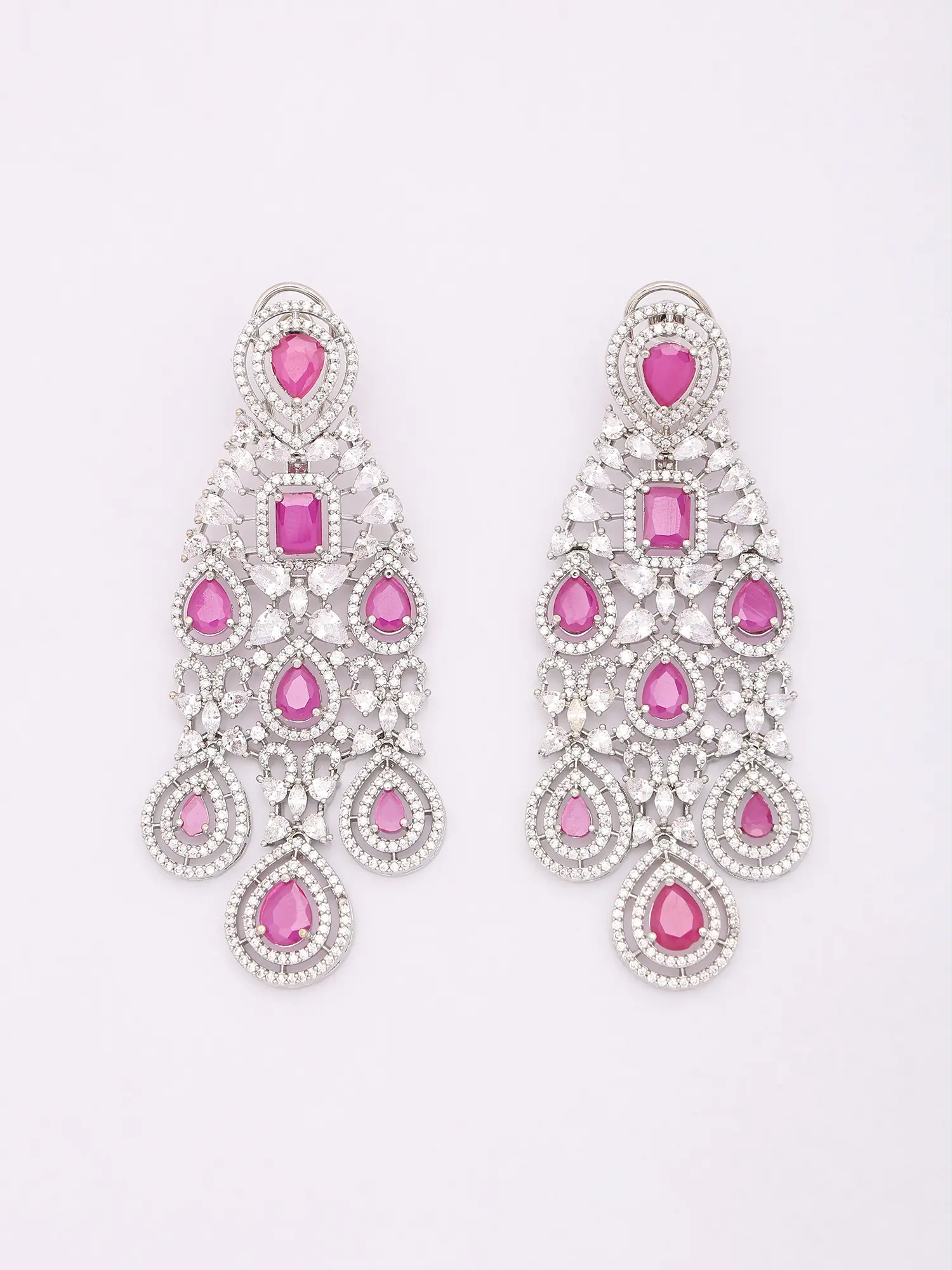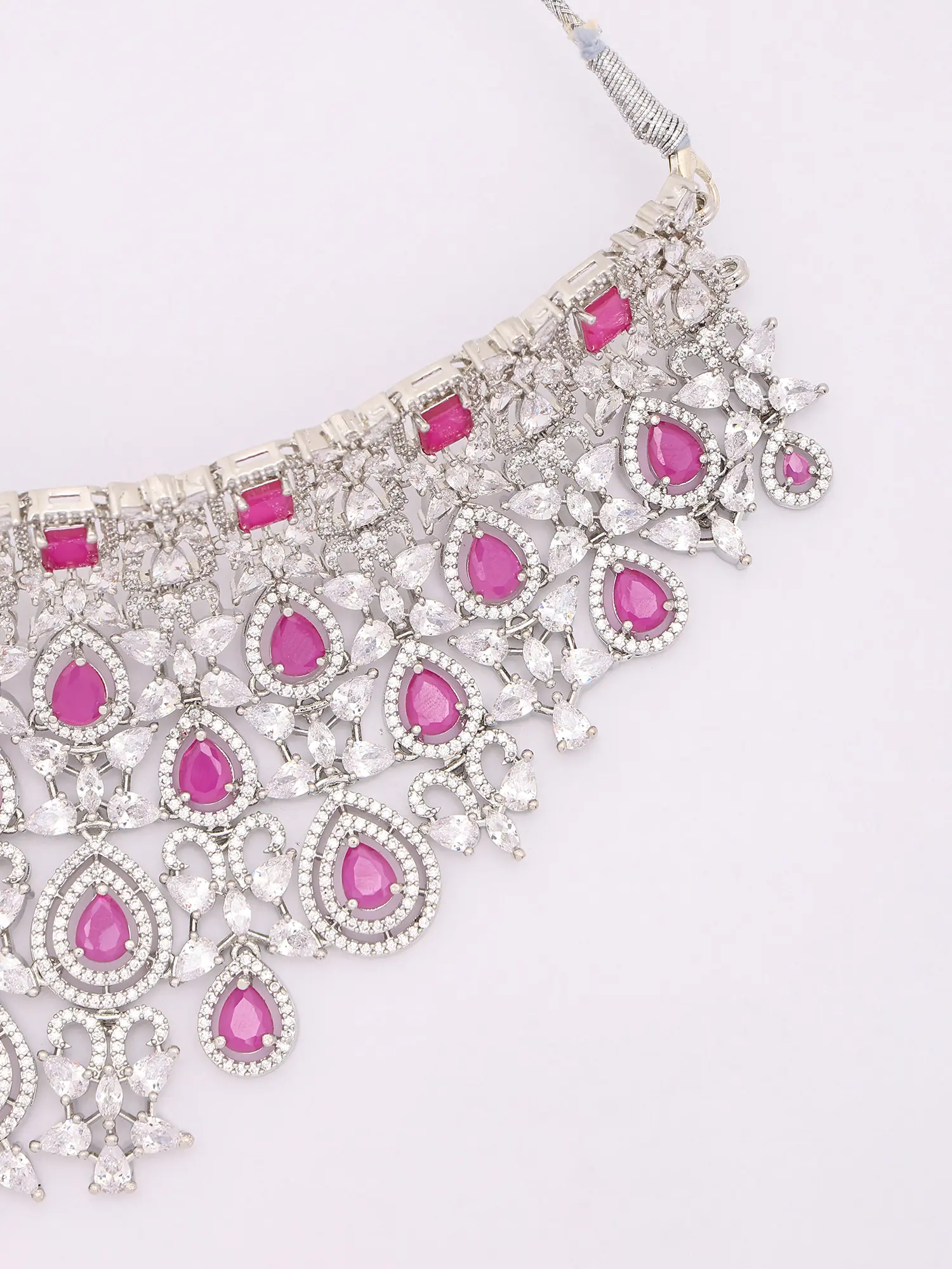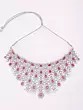 Features a striking necklace adorned with brilliant pink stones and clear cubic zirconia.