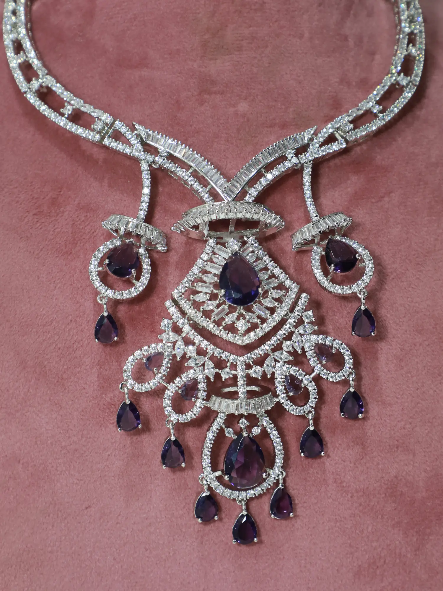 Comes with matching chandelier earrings, designed to complement the necklace's intricate style.