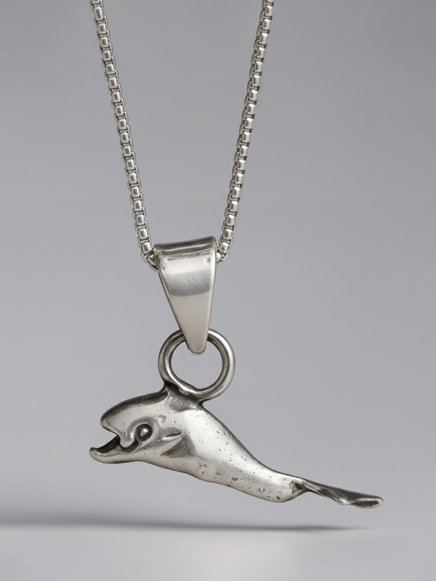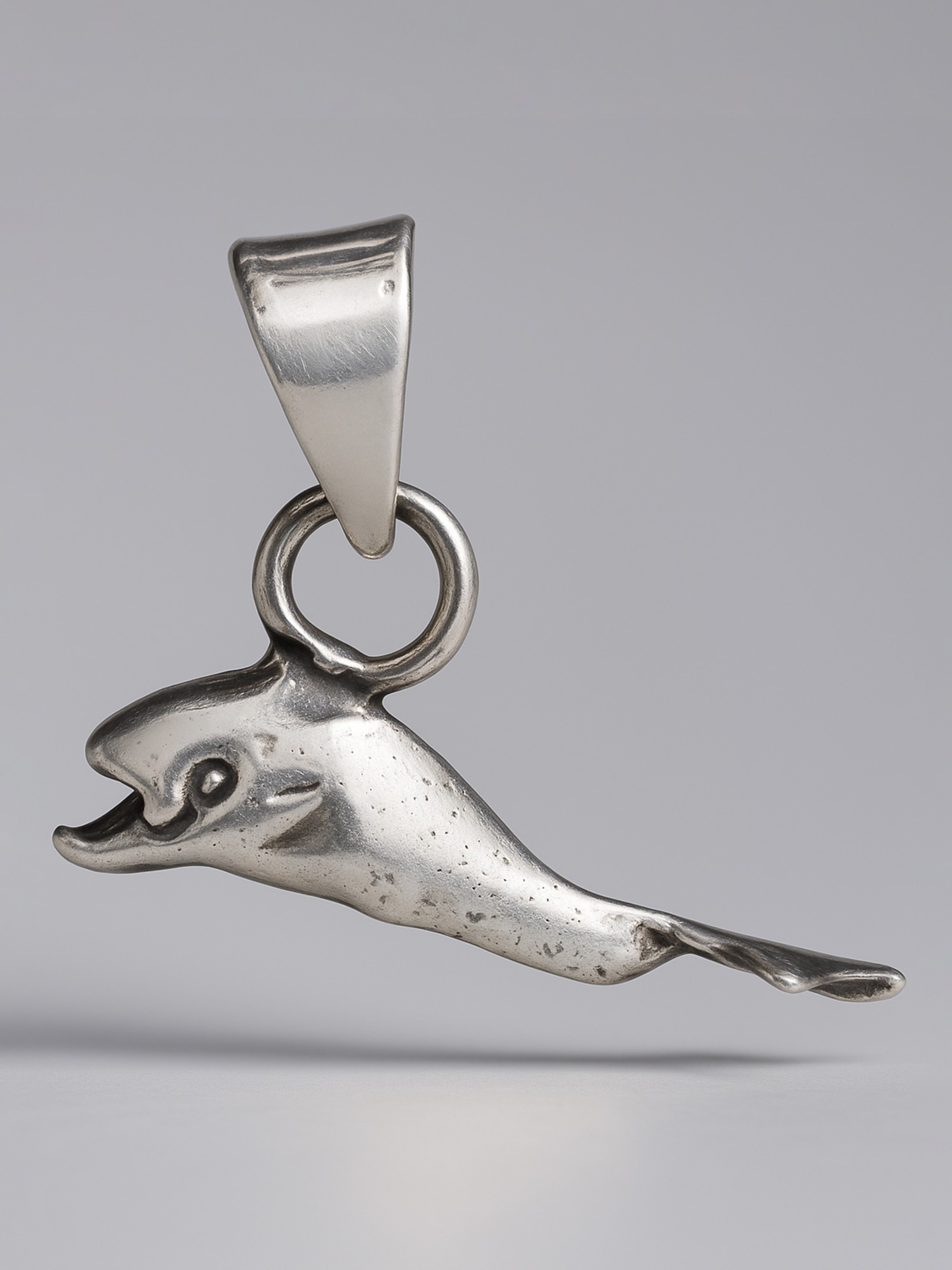 Dolphins are believed to be the purest of souls. They spread smiles as they swim. This Sterling Dolphin Pendant is a graceful embodiment of the happy mammal. Crafted in sterling silver, this pendant captures the fluidity and charm of a dolphin in a timeless design. Whether worn for its symbolic significance or simply for its aesthetic appeal, this pendant is a delicate and enchanting accessory that resonates with the beauty of the ocean.