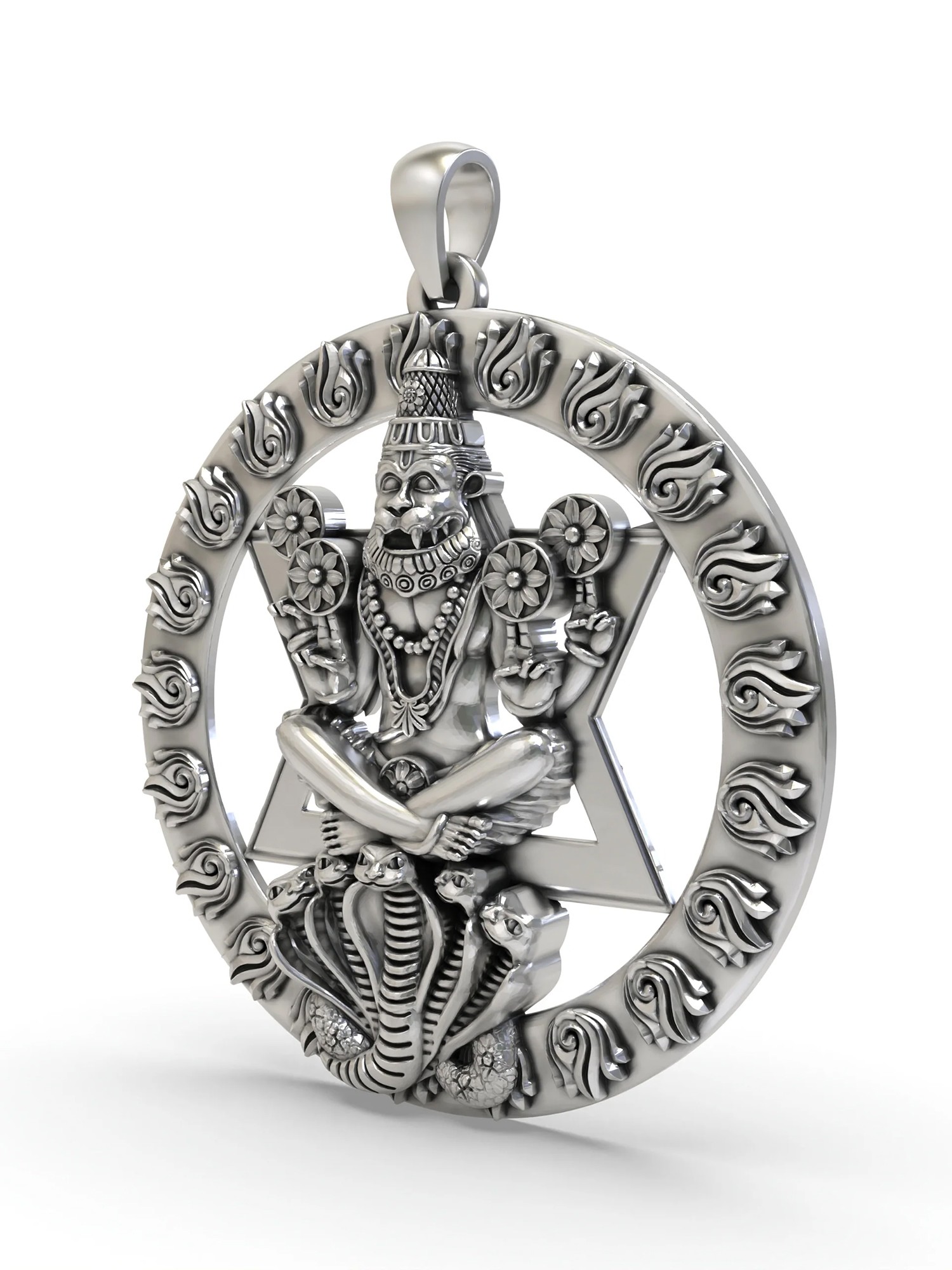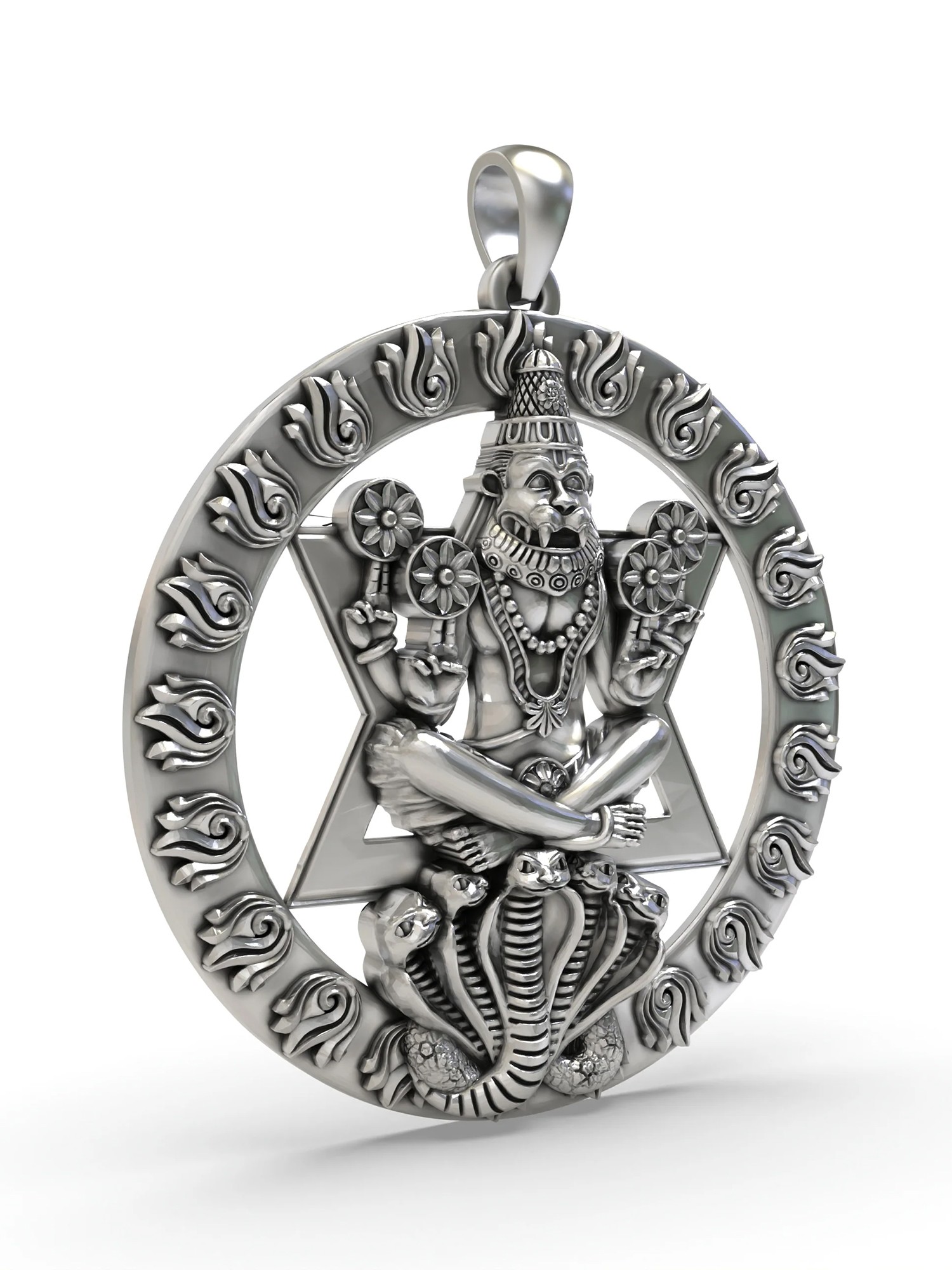Each pendant is meticulously crafted from premium sterling silver, chosen for its durability and timeless appeal. The polished finish accentuates the intricate details, from the swirling flames around the border to the serene expression of Lord Narasimha and the textured scales of the serpent. This piece is designed to be a constant companion, offering a sense of peace, courage, and spiritual grounding to its wearer. It makes an exceptional gift for loved ones, a meaningful way to convey blessings of protection and prosperity. Wear it as a symbol of your faith, a conduit for positive energy, or simply as a stunning piece of finely crafted jewelry.