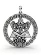 This exquisite pendant is a testament to the fusion of spiritual symbolism and masterful craftsmanship. Cast in lustrous sterling silver, it embodies the fierce yet protective avatar of Lord Vishnu, Narasimha. The design is intricately detailed, capturing the divine power and serene composure of this revered deity. The pendant is circular, framed by a band adorned with stylized flames, symbolizing purity, spiritual energy, and the removal of obstacles. Within this fiery embrace lies a Star of David, a potent symbol representing the divine connection between the celestial and earthly realms.