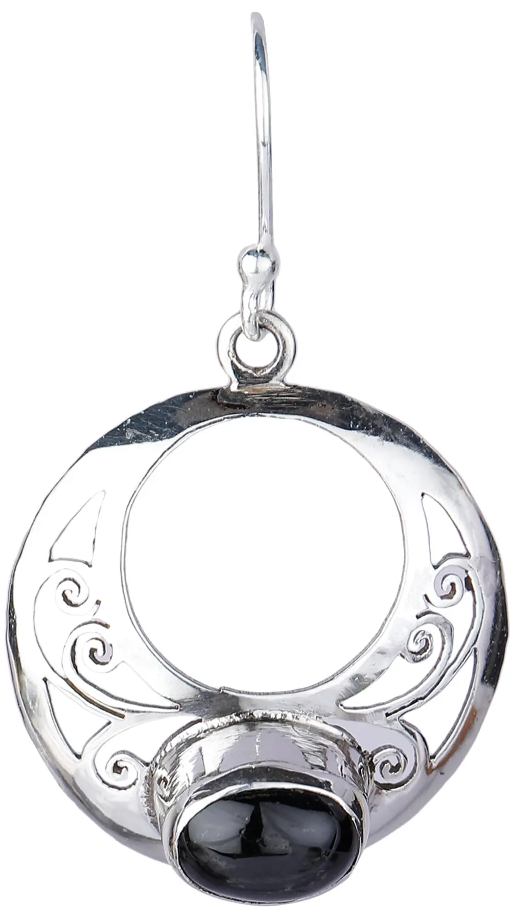 At the heart of each earring lies a beautifully polished black onyx gemstone. Known for its deep, velvety blackness, onyx is a stone that exudes sophistication and power. Its smooth, cabochon cut allows for maximum light reflection, enhancing its natural richness and depth. Black onyx is often associated with grounding, protection, and strength, making these earrings not only a beautiful accessory but also a meaningful one. The contrast between the lustrous sterling silver and the profound darkness of the onyx creates a dramatic and eye-catching statement.