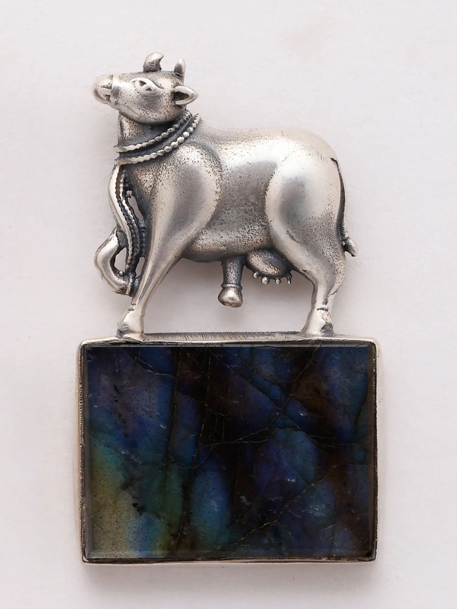 The charm of the sterling silver cow is beautifully complemented by a striking rectangular gemstone. Set in a clean, polished bezel, the deep, enigmatic hue of the gemstone provides a dramatic contrast to the lustrous silver. This bold pairing creates a sophisticated look that is both contemporary and classic. The smooth, cool surface of the gemstone adds a touch of refined elegance, making these earrings suitable for a variety of occasions, from casual daytime wear to more formal evening events. Their design allows them to be noticed without overpowering your ensemble, offering a perfect balance of presence and grace. ––––––––––––––––––––