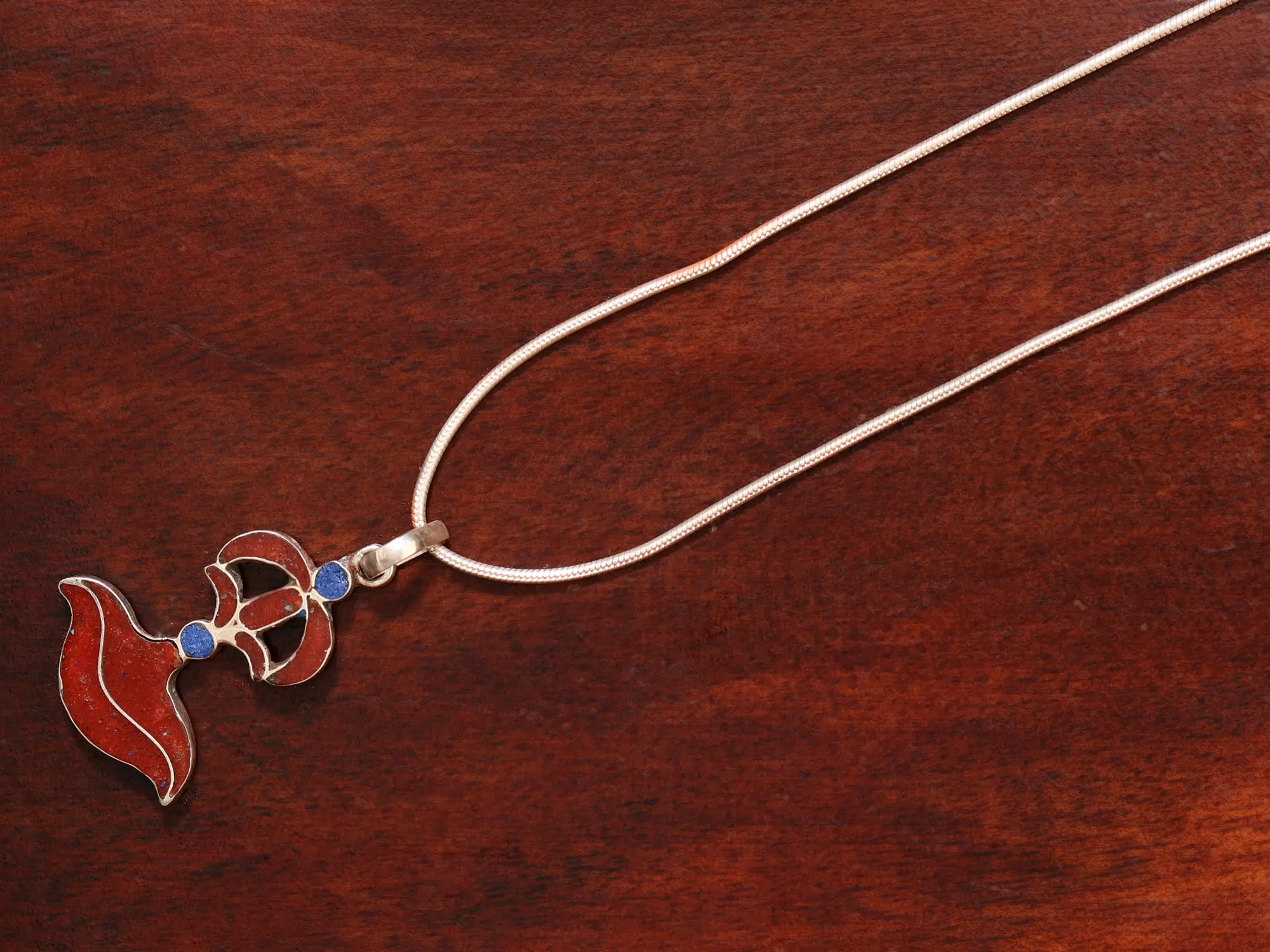 Fashioned from high-quality sterling silver, this pendant offers lasting beauty and durability. The silver provides a subtle luster that perfectly complements the intricate design. Its hypoallergenic qualities ensure comfortable wear for all skin types. The fine metalwork accentuates the pendant's distinctive form, creating a piece that is both visually captivating and spiritually meaningful. The inlay work showcases vibrant colors set against the cool silver, adding to the unique artistry of this piece.
