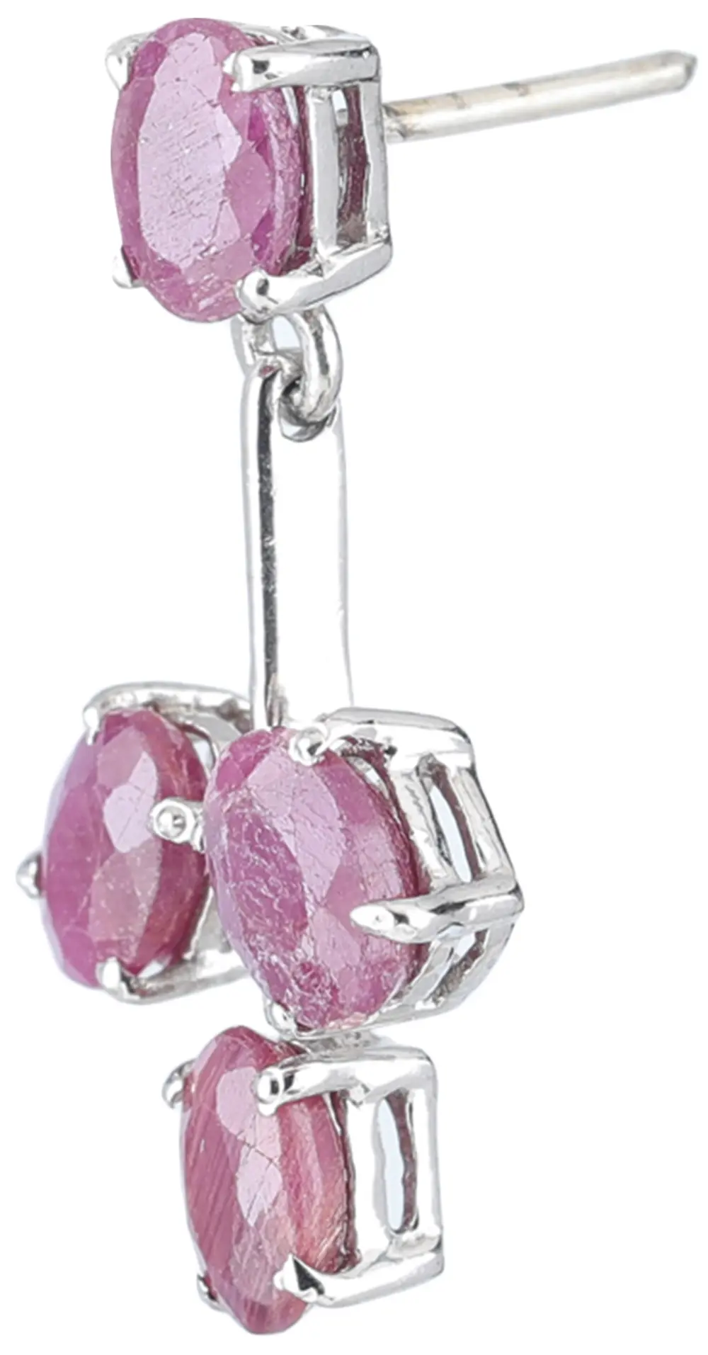 This pair of fashion earrings are topped with an oval-shaped ruby gemstone, connected beautifully with a triangular branch of similar ruby gemstones. Every gemstone is well connected with a strong sterling silver line that contrasts charmingly with the bright red-pink shade. One of the most unique qualities of a ruby gemstone is that it goes well with all colors in casual as well as formal meets enhancing the personality of the wearer. Purchase these pair of earrings to have those lavish sets in your jewellery box.