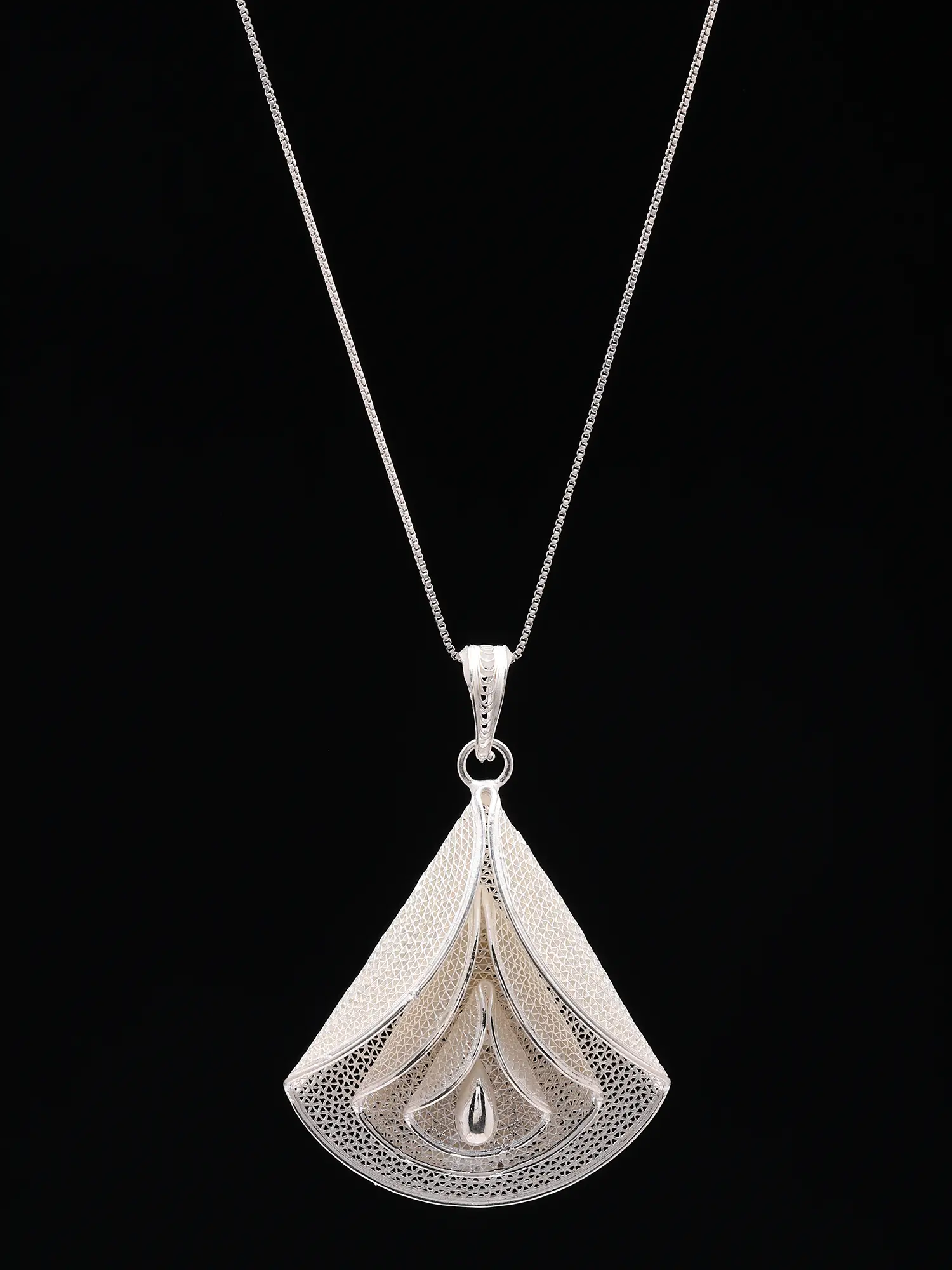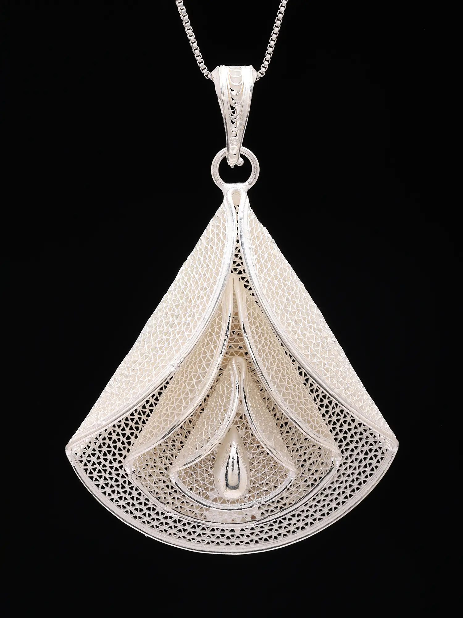 Features an intricate sterling silver filigree pendant showcasing delicate wirework patterns.