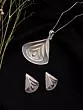 The pendant, a generous 2.65 inches in height, cascades with layered, openwork contours that evoke the delicate unfurling of a petal or the gentle flow of water. Its intricate latticework allows light to play through, creating a mesmerizing dance of shadows and highlights. The accompanying earrings, elegantly proportioned at 1.03 inches in height and 0.85 inches in width, echo the pendant's captivating design. Their triangular form, subtly curved and detailed with the same artisanal precision, ensures a harmonious and striking visual balance.