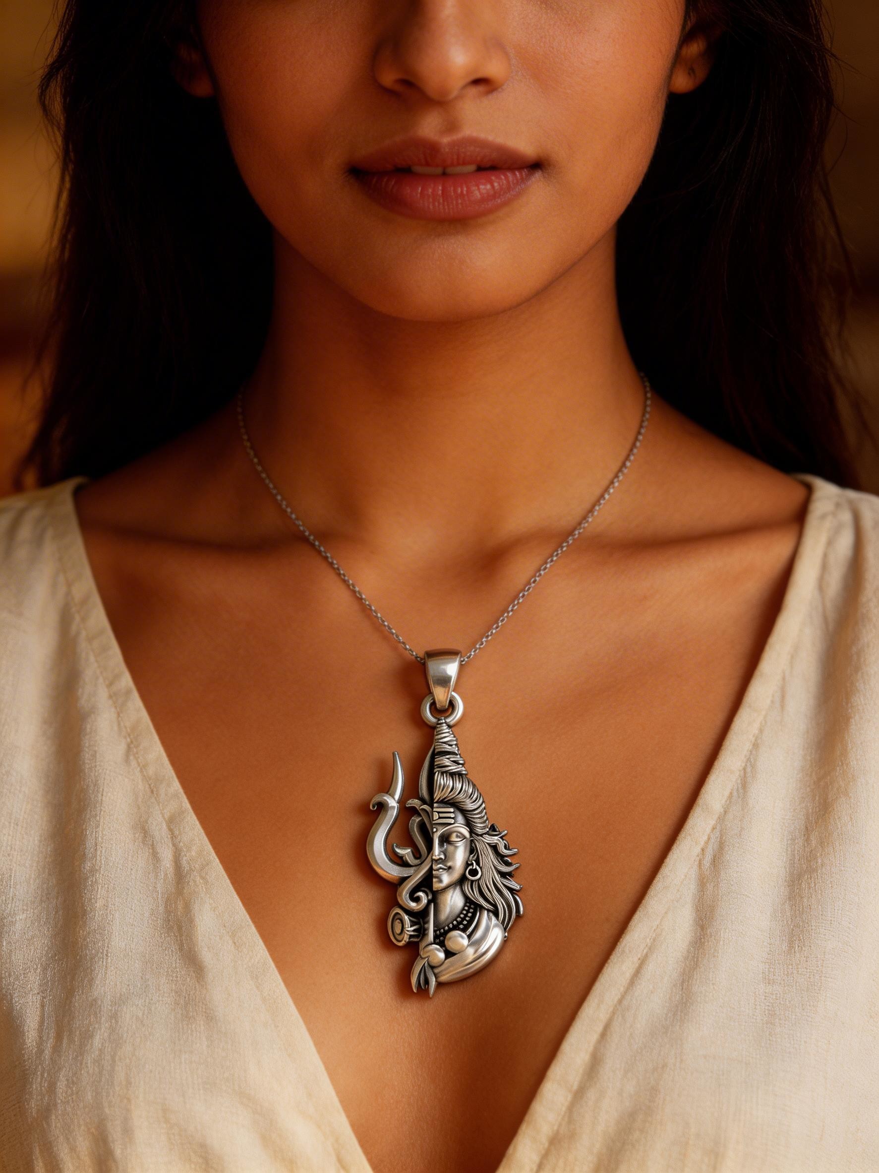 More than just a piece of jewelry, this pendant serves as a powerful symbol of faith and devotion. It can be worn as a reminder of Shiva's teachings and his role as the destroyer of illusions and the source of transformation. Whether you're drawn to its artistic design or its spiritual significance, this pendant is sure to become a cherished accessory. Its unique and meaningful design makes it a thoughtful gift for anyone interested in Hindu mythology, spirituality, or simply appreciates beautiful and symbolic jewelry. This pendant effortlessly adds a touch of spirituality and cultural appreciation to any outfit. The pendant is easily paired with a variety of chains or cords to suit individual preferences.