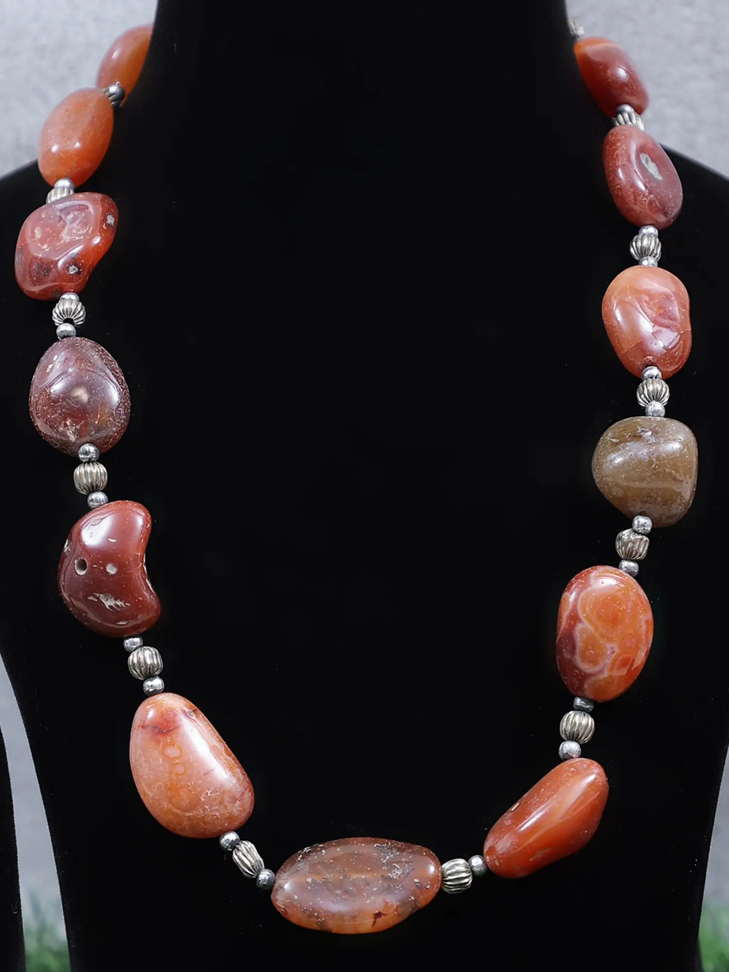 This exquisite necklace is a celebration of natural beauty, crafted with carefully selected carnelian gemstones and complemented by the elegant sheen of sterling silver. Each carnelian bead is unique, showcasing the gemstone's captivating variations in color and translucency, ranging from deep reddish-orange to a softer, honeyed hue. The organic shapes of the beads, ranging from smooth and rounded to subtly irregular, add to the necklace's artisan appeal and organic feel, hinting at the gemstone's ancient origins. The rich, warm tones of the carnelian create a piece that's both eye-catching and versatile, perfectly suited to complement a range of styles and occasions.