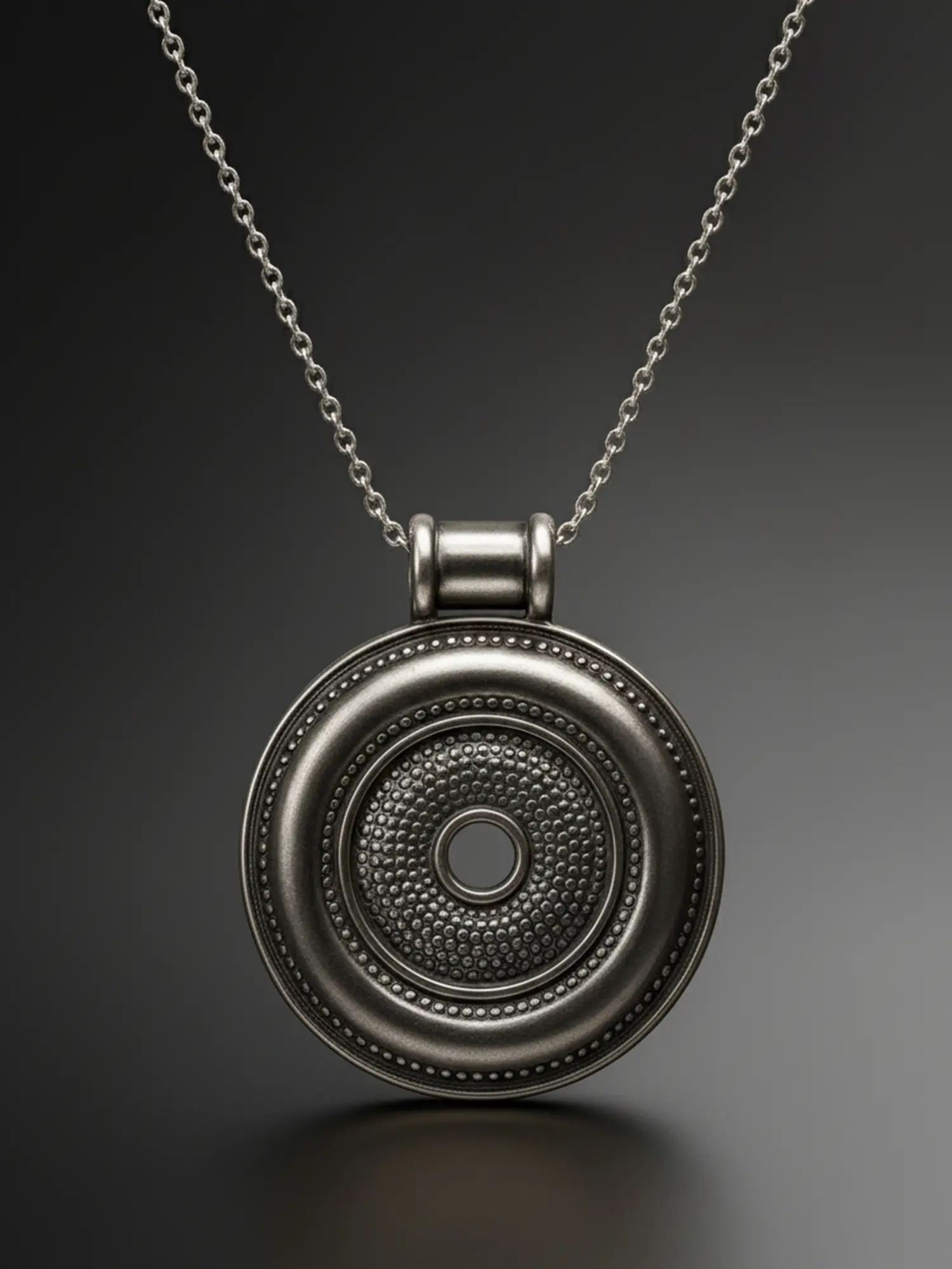 The substantial presence is immediately apparent, measuring a striking 2.4 inches in height and 2.0 inches in width, making it a captivating centerpiece. Its circular form is adorned with a finely beaded border, encircling a central panel of precisely patterned textures that draw the eye inward. The integrated bail is both robust and elegantly designed, ensuring a secure and graceful drape from your chosen chain.