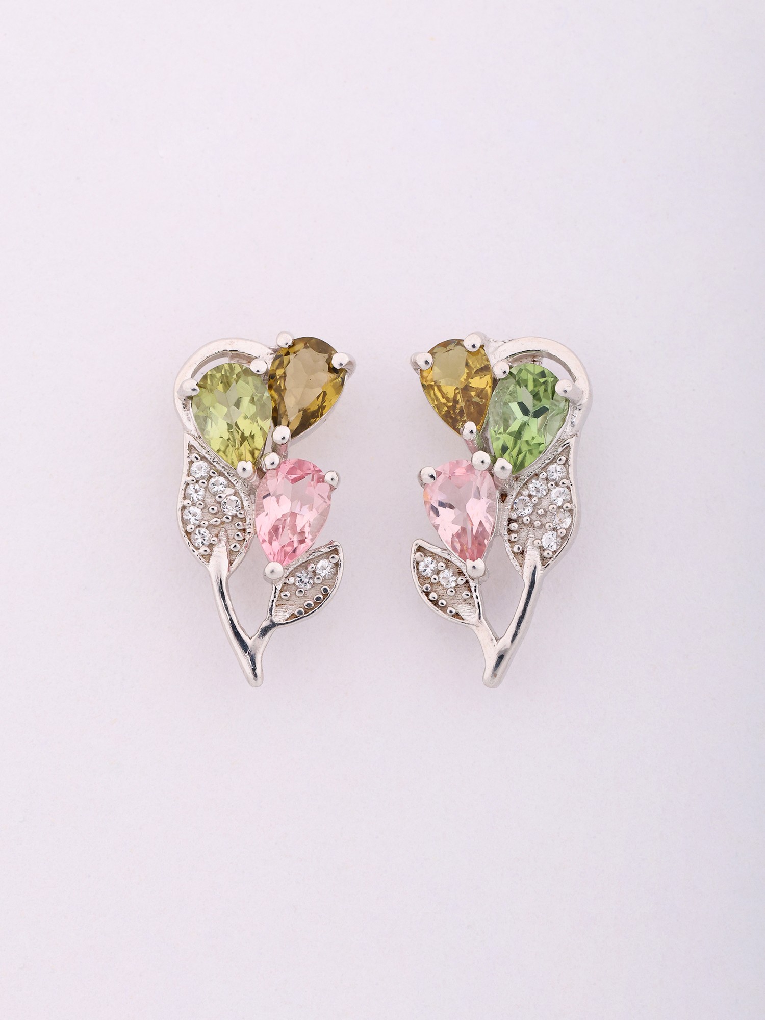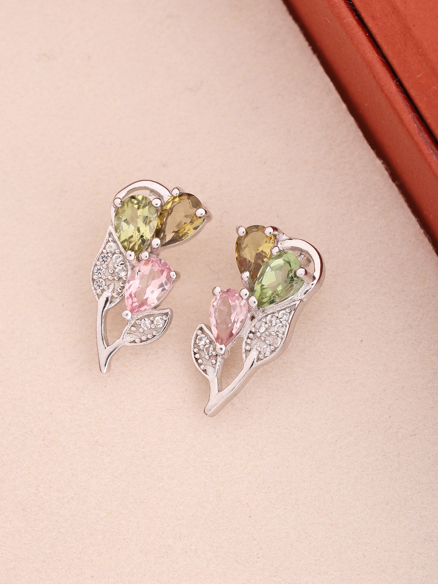 Sterling Silver Stud Earrings with Multi-Color Tourmaline Floral Accents