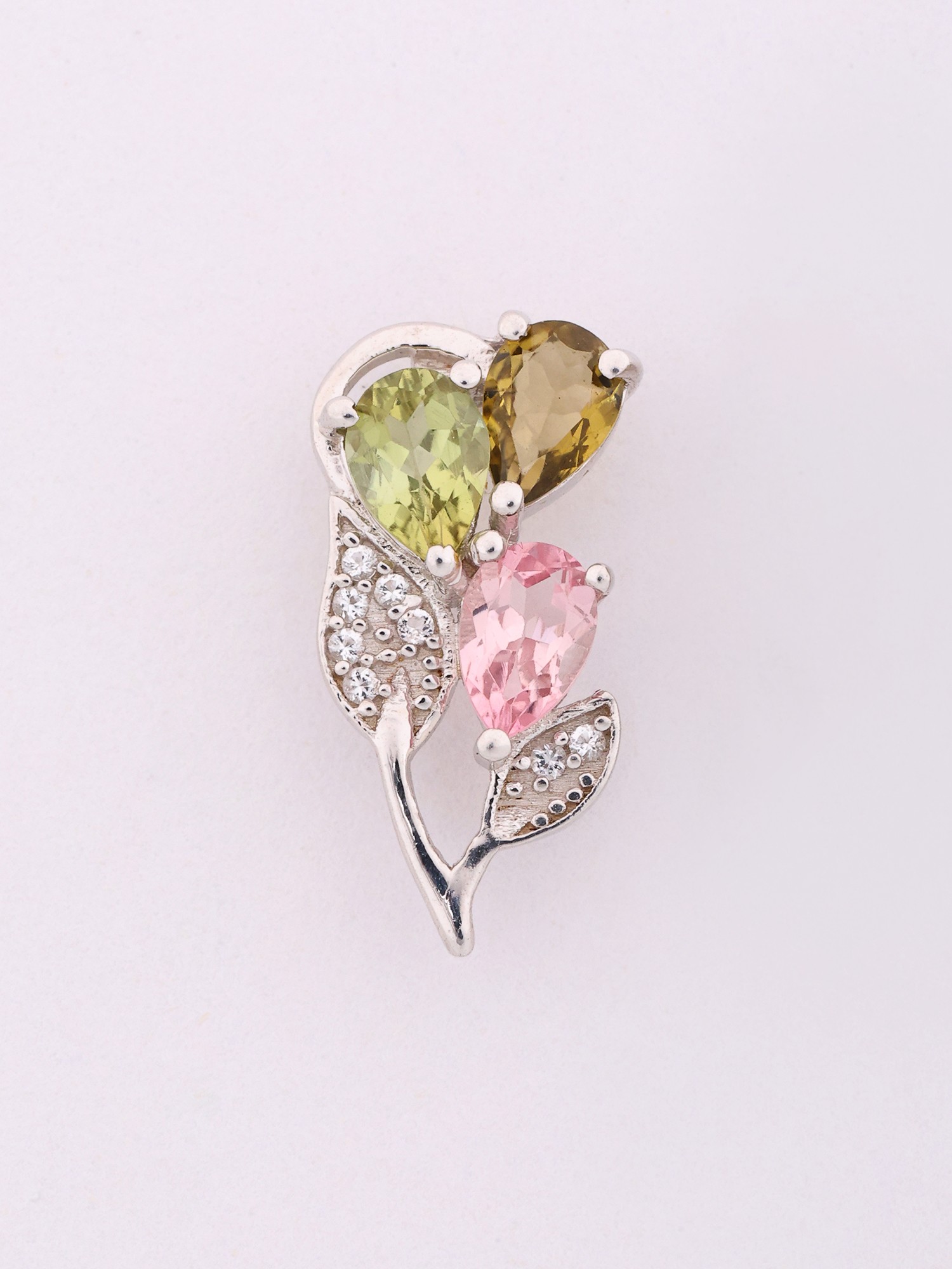 Features pear-cut tourmaline gemstones in striking green and pink hues.