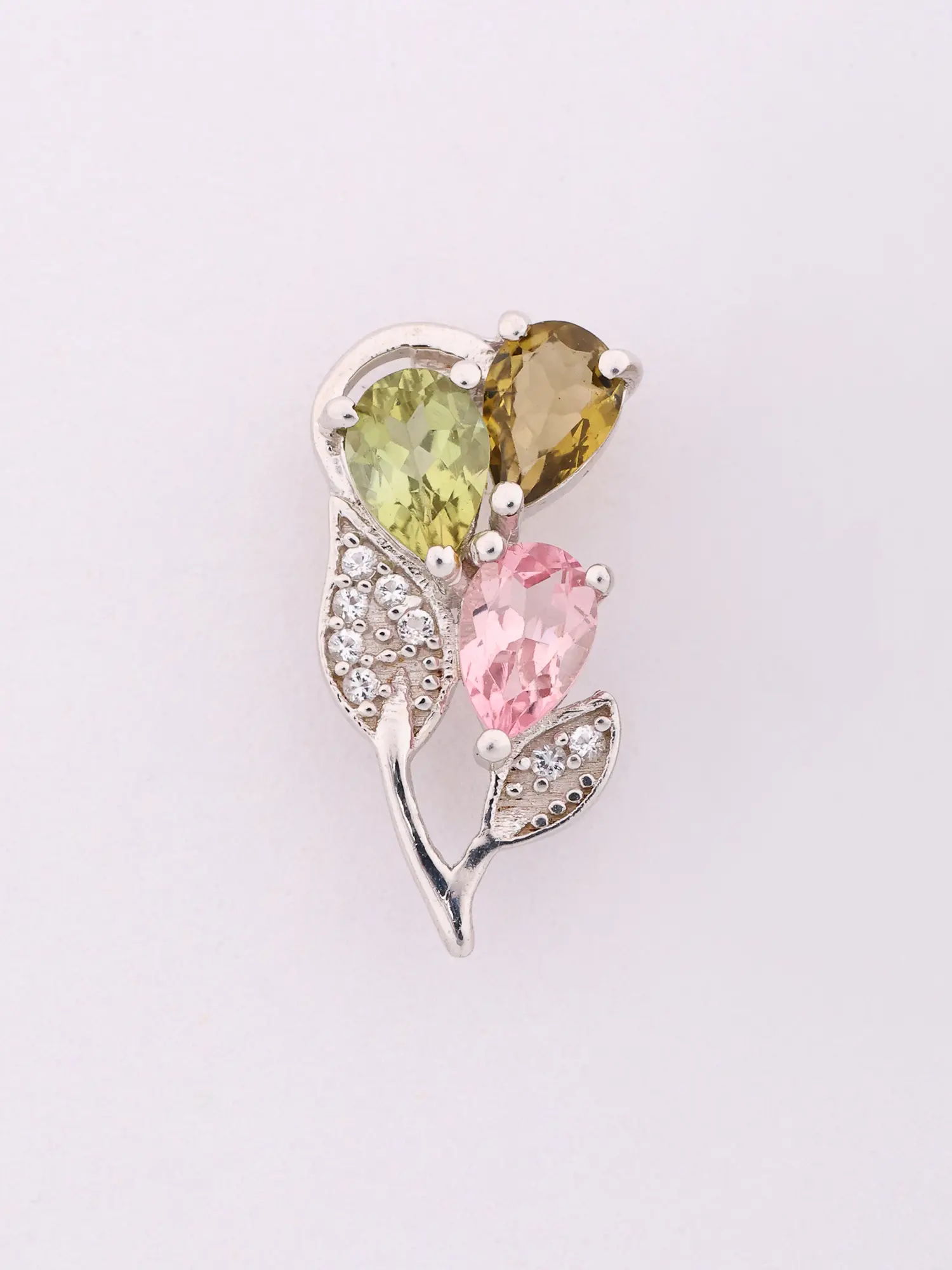 Adorning these silver forms are pear-shaped tourmaline stones, presented in a delightful gradient of soft pink and verdant green. These precious gems are precisely cut to maximize their inherent brilliance, catching the light with every movement. Tiny, sparkling accents, reminiscent of dew drops, are thoughtfully placed along the leaf veins, further enhancing their captivating allure. The overall composition measures approximately 0.7 inches in height and 0.3 inches in width, offering a noticeable yet perfectly balanced presence.