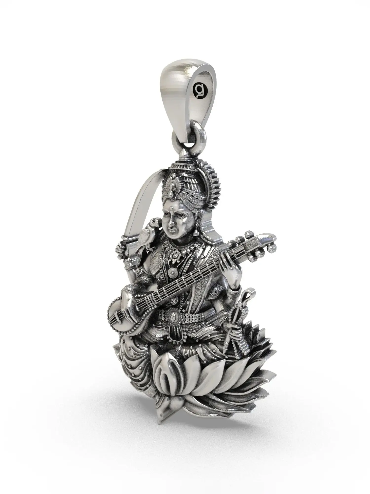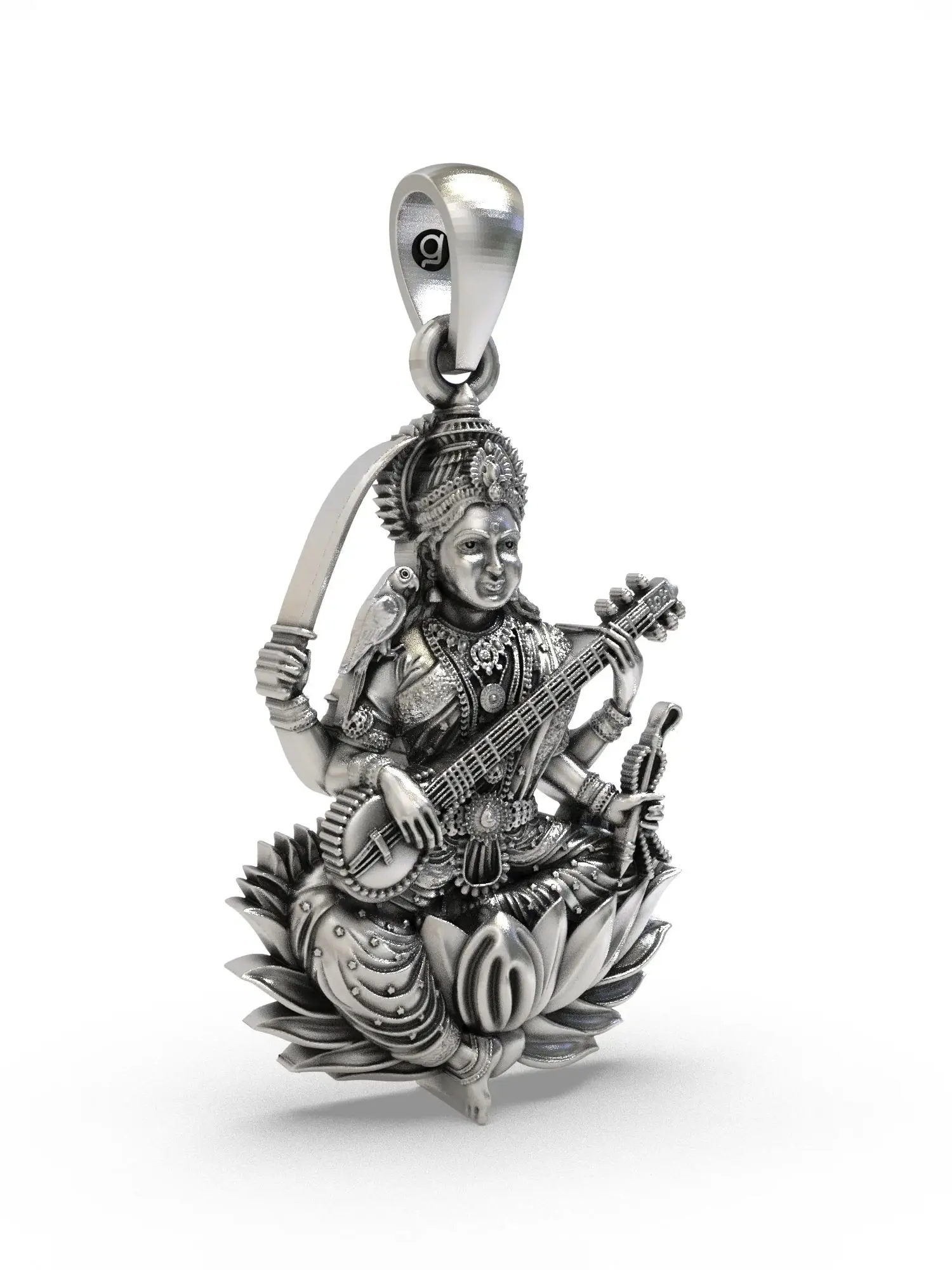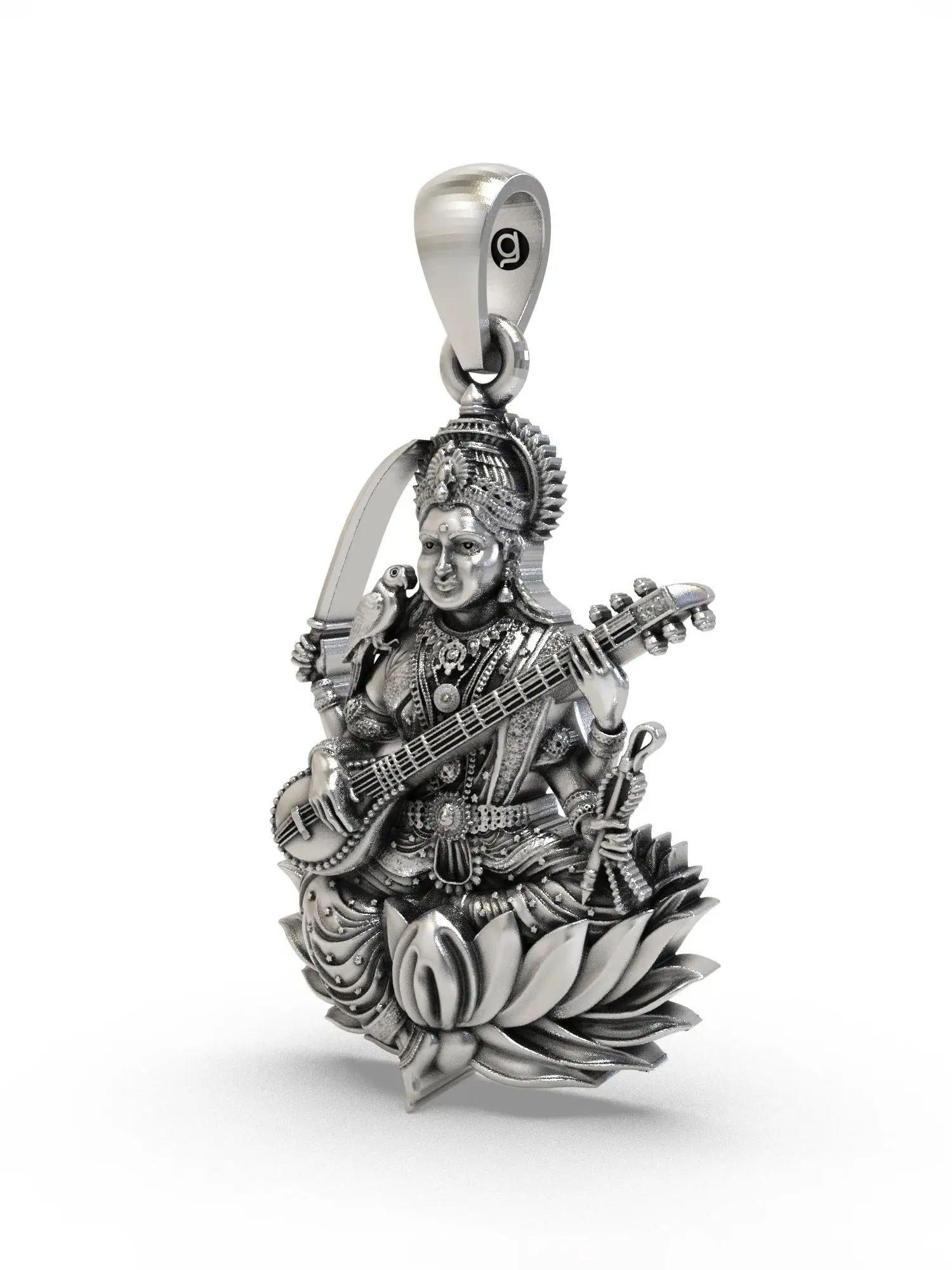 Measuring approximately 1.20 inches in height and 0.55 inches in width, this pendant is a perfectly proportioned miniature sculpture. The representation of the goddess is rendered with remarkable clarity, showcasing her iconic attributes that speak to her multifaceted nature. You'll observe the serene posture, the graceful handling of the veena, and the subtle yet powerful presence of the sword and the accompanying bird. These elements combine to create a visually captivating piece that invites closer inspection and admiration, its .55-inch width allowing for a delicate yet substantial statement.
