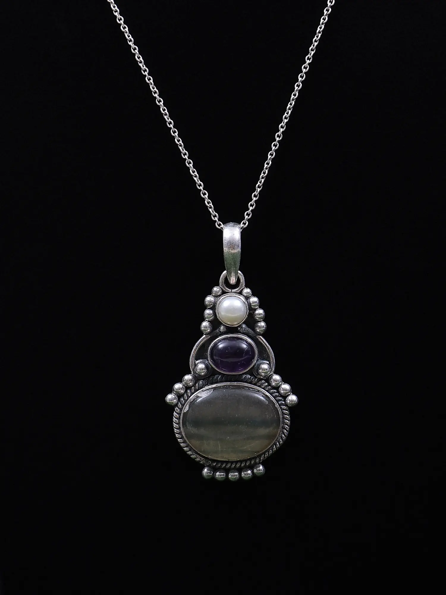 Bring all the beautiful stars and make a pendant for me, I shall wear it till I become one. This Sterling Silver Pendant with Labradorite, Amethyst, and Pearl stone is a pendant that seems to be made from all things good. The base metal is silver which infuses the jewelry with the goodness of the metal. It is also decorated with Labradorite, Amethyst, and Pearl Stone which have their significance in activating the chakras of a body. The stones are arranged in ascending order, the labradorite is the biggest stone and is placed at the bottom, then the amethyst, and then the pearl. The light-to-dark arrangement creates a beautiful feel of the northern lights and elevates the look.