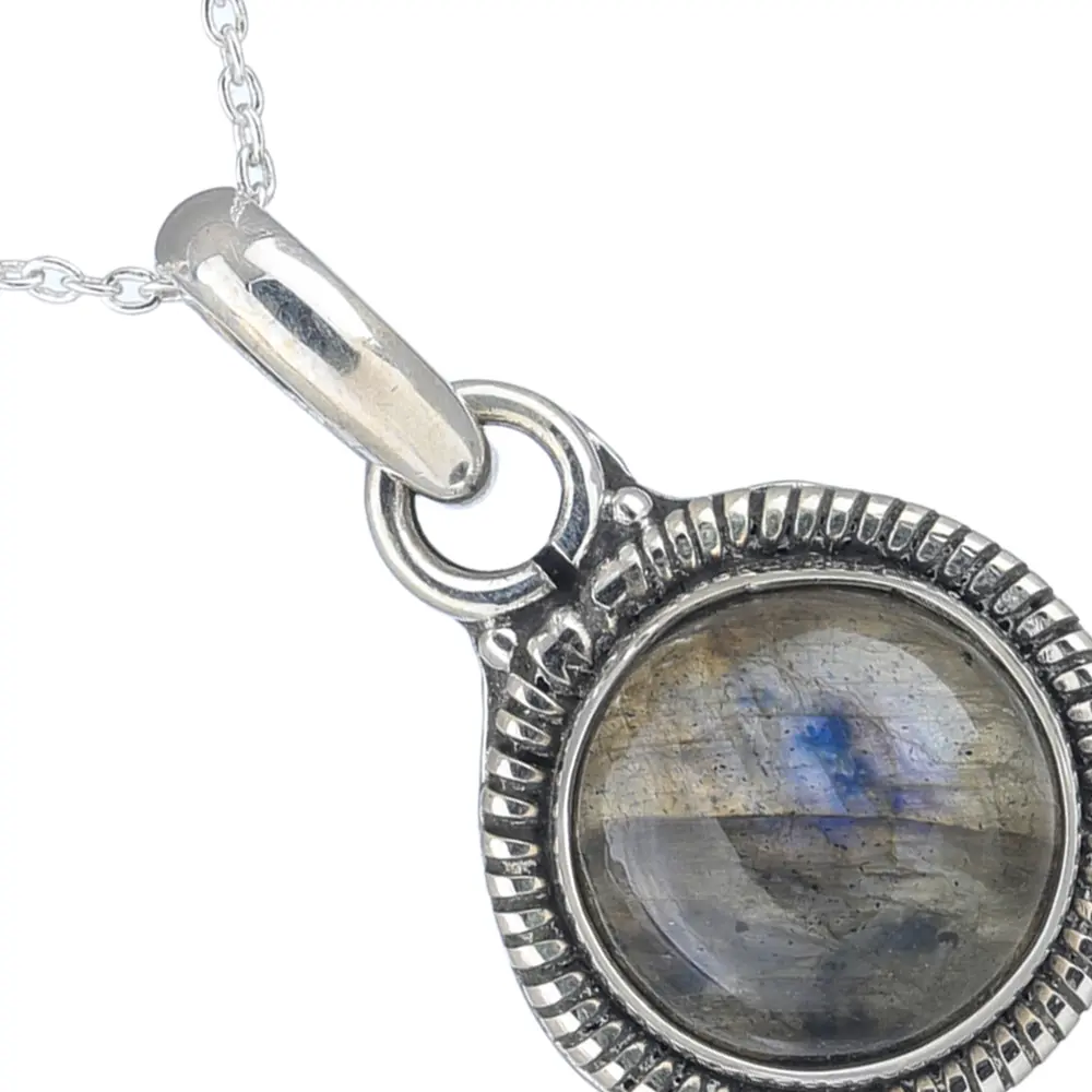 Embrace the enticing mystery of this round-shaped pendant. This stunning piece of jewelry highlights the shimmering and distinct charm of the gemstones while capturing the captivating dance of colours within them. The round cut of the jewels gives the design a timeless quality, and the sterling silver setting accentuates its beauty.