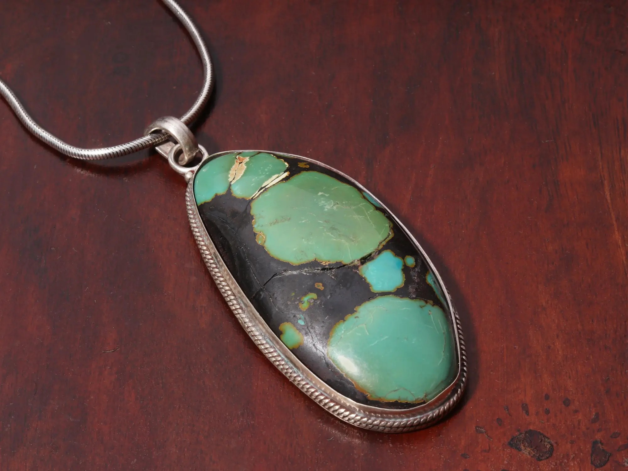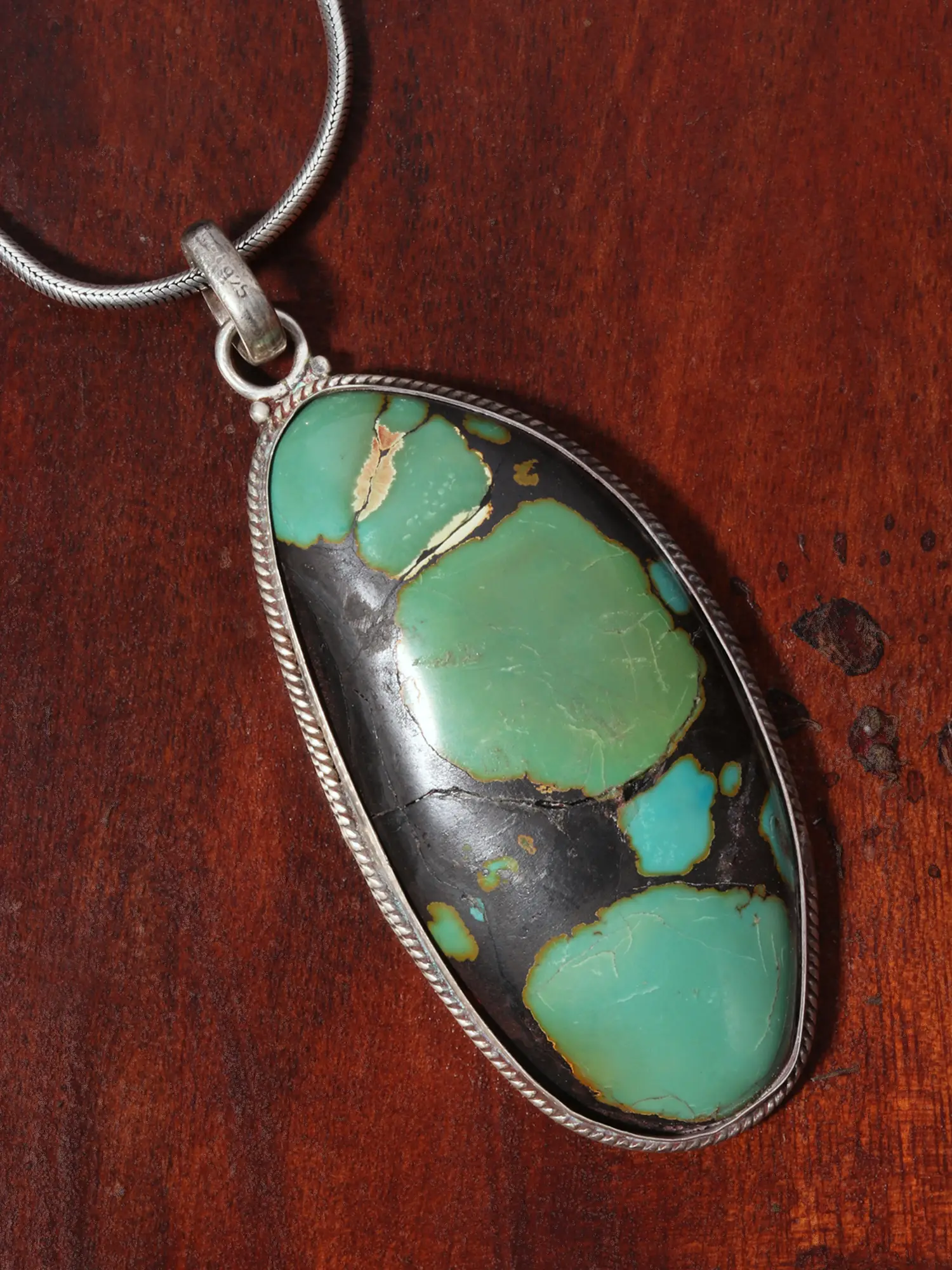 This sterling silver turquoise pendant is the ideal accessory for adding a touch of sophistication and natural beauty to your everyday look. Its timeless design makes it perfect for a wide variety of occasions, from casual daytime wear to elegant evening events. Whether you're dressing up for a special occasion or simply adding a touch of personal style to your daily attire, this pendant is a versatile and beautiful choice. Pair it with your favorite jeans and a simple t-shirt for a casual yet chic look, or dress it up with a little black dress for a touch of understated glamour. It is a truly versatile piece that effortlessly transcends trends.