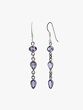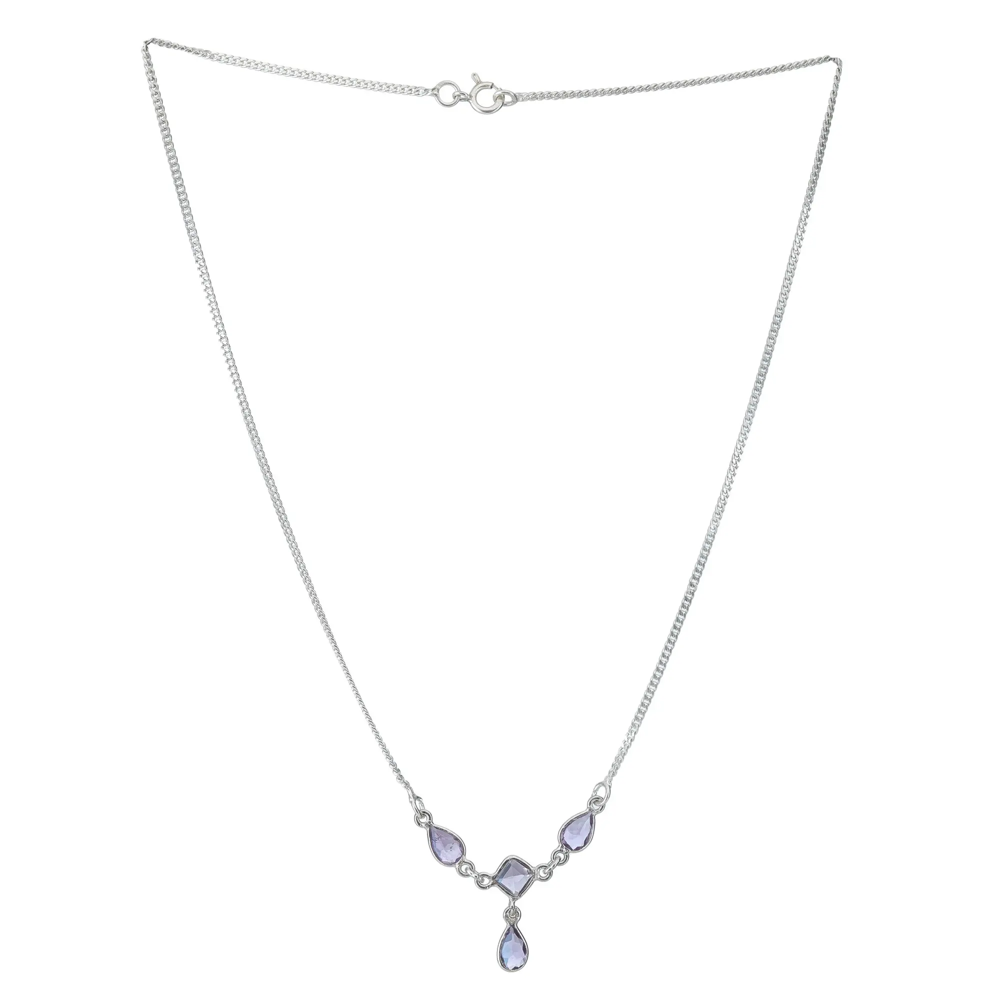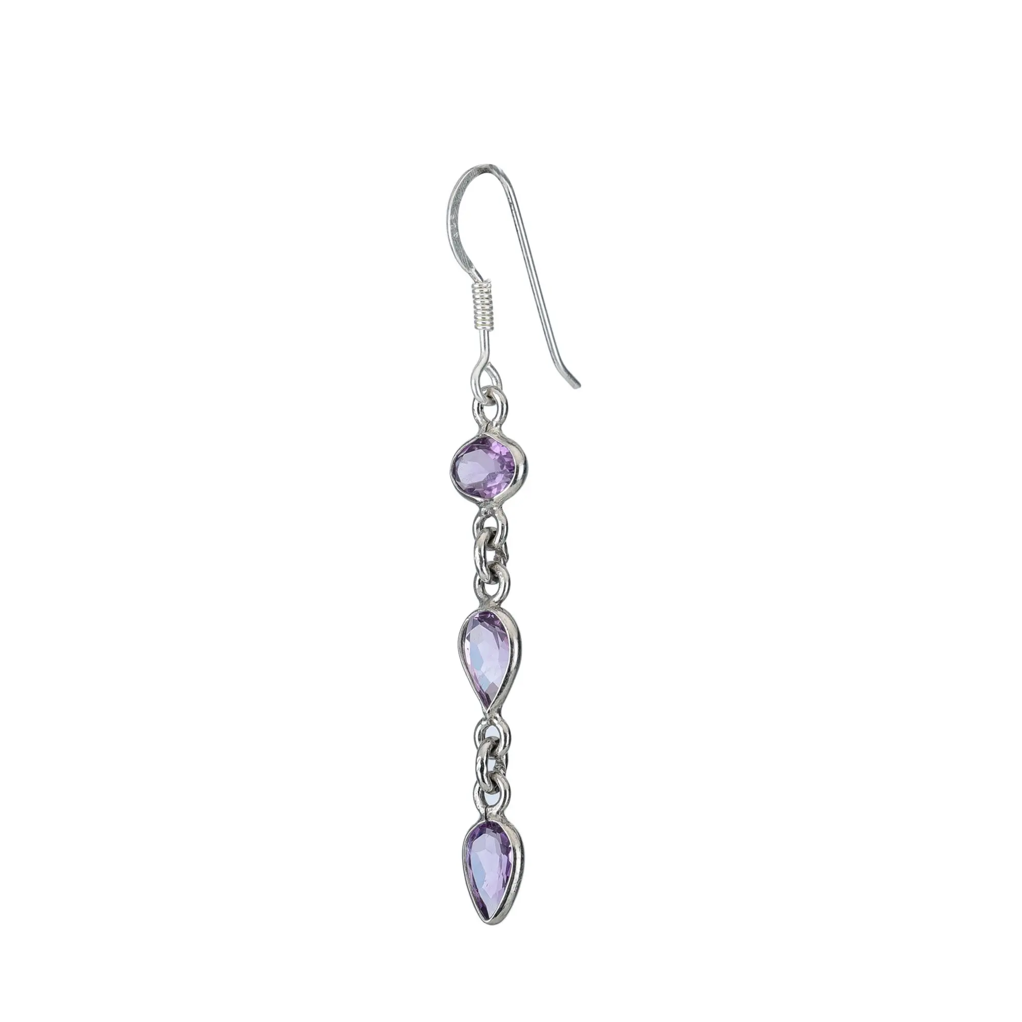 The necklace boasts a delicate curb chain, ensuring comfortable wear throughout the day. The pendant features a central, square-cut amethyst surrounded by two pear-shaped amethysts on either side, creating a beautifully balanced and harmonious design. The earrings mirror this design, with three amethysts – one oval and two pear-shaped – suspended gracefully from sterling silver hooks. The overall length of the necklace is 17 inches, while the earrings measure 2 inches in height. This harmonious interplay of shapes and sizes creates a visually striking and memorable effect. The high-quality craftsmanship is evident in every detail, from the secure clasp on the necklace to the meticulous setting of the gemstones.
