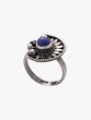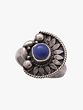 This ring is adorned with a lapis lazuli gemstone, recognized for its deep blue color. Lapis lazuli is esteemed for its properties often associated with spiritual enlightenment, heightened inner vision, and self-awareness. It is believed to activate the third eye chakra, which is said to enhance intuition, psychic abilities, and facilitate spiritual growth. The stone is set in a detailed silver band with a vintage-inspired design that complements its mystical appearance.