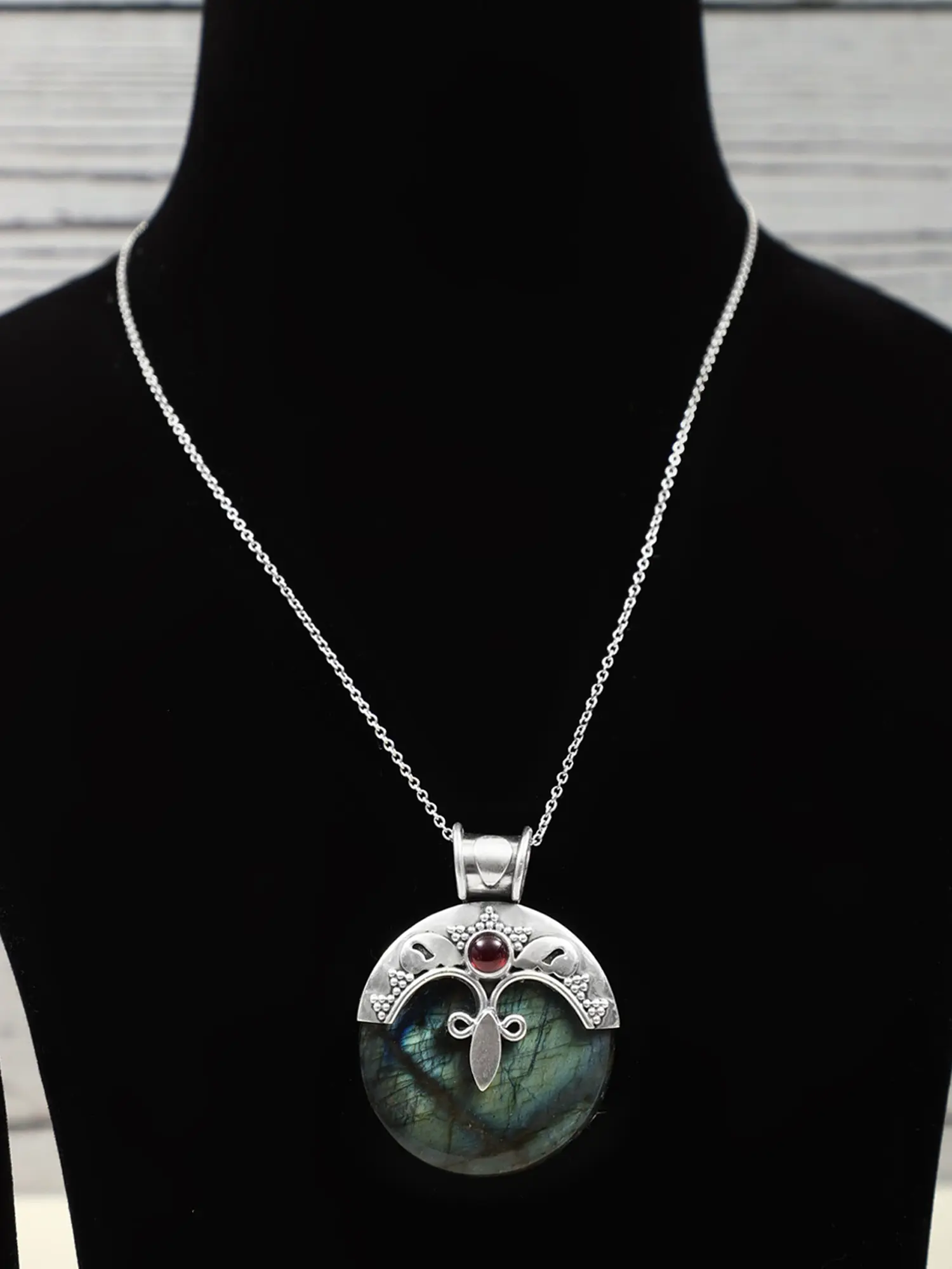 This piece is much more than a simple pendant; it is a reflection of your unique style and appreciation for exquisite detail. The Labradorite is known for its powerful metaphysical properties, believed by some to enhance intuition, creativity, and spiritual connection. The garnet gemstone adds a boost of energy, passion, and vitality. It is a statement of elegance and sophistication, a perfect gift for yourself or someone special, an heirloom-quality piece that will be treasured for generations. The subtle yet striking design captures the attention without overwhelming the eye, making it a versatile piece that can be dressed up or down.