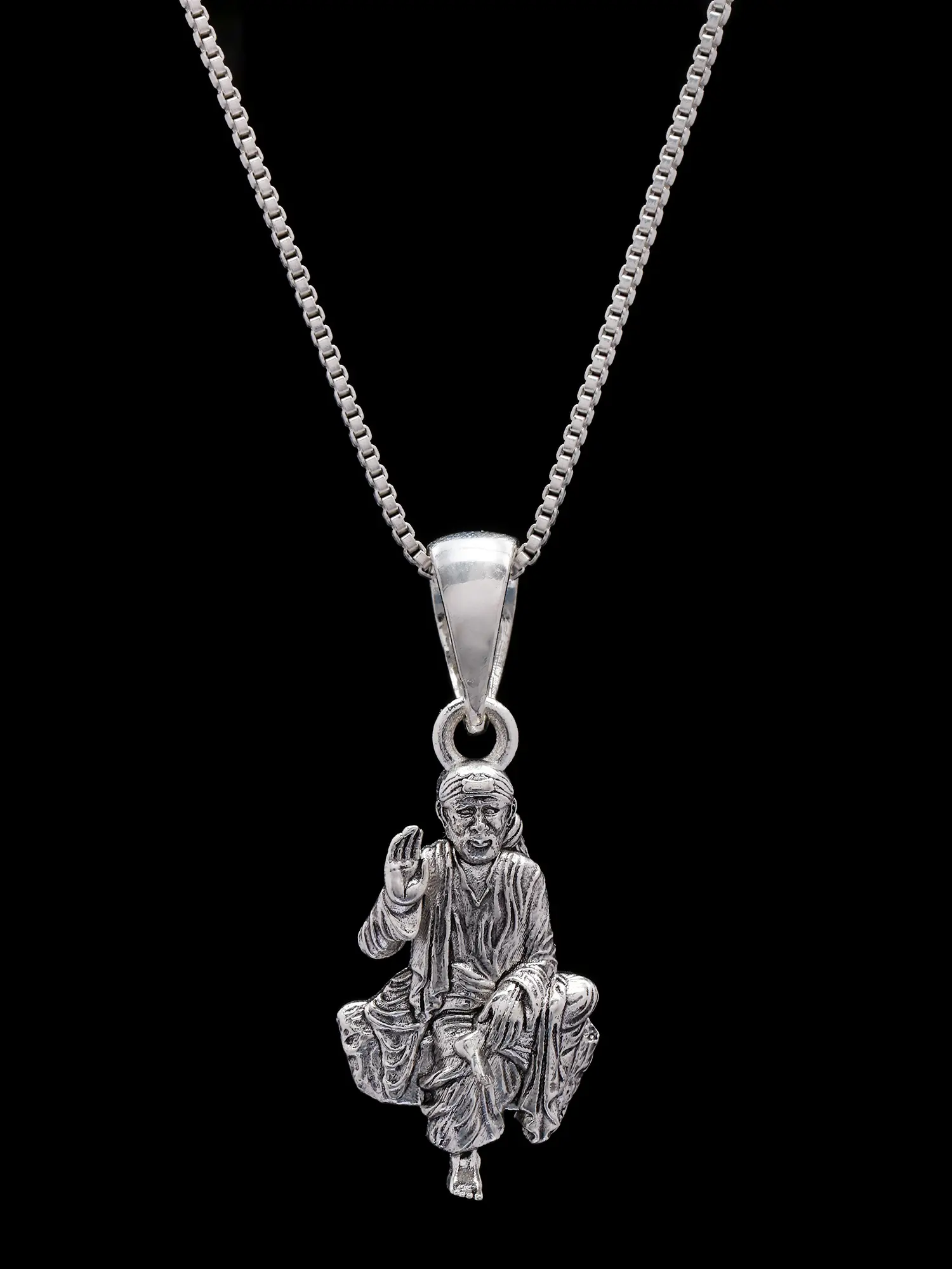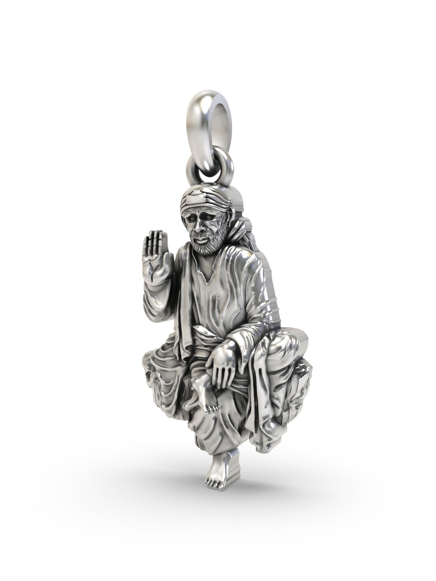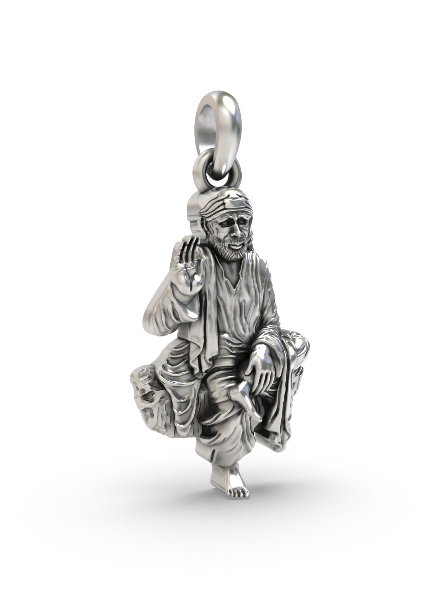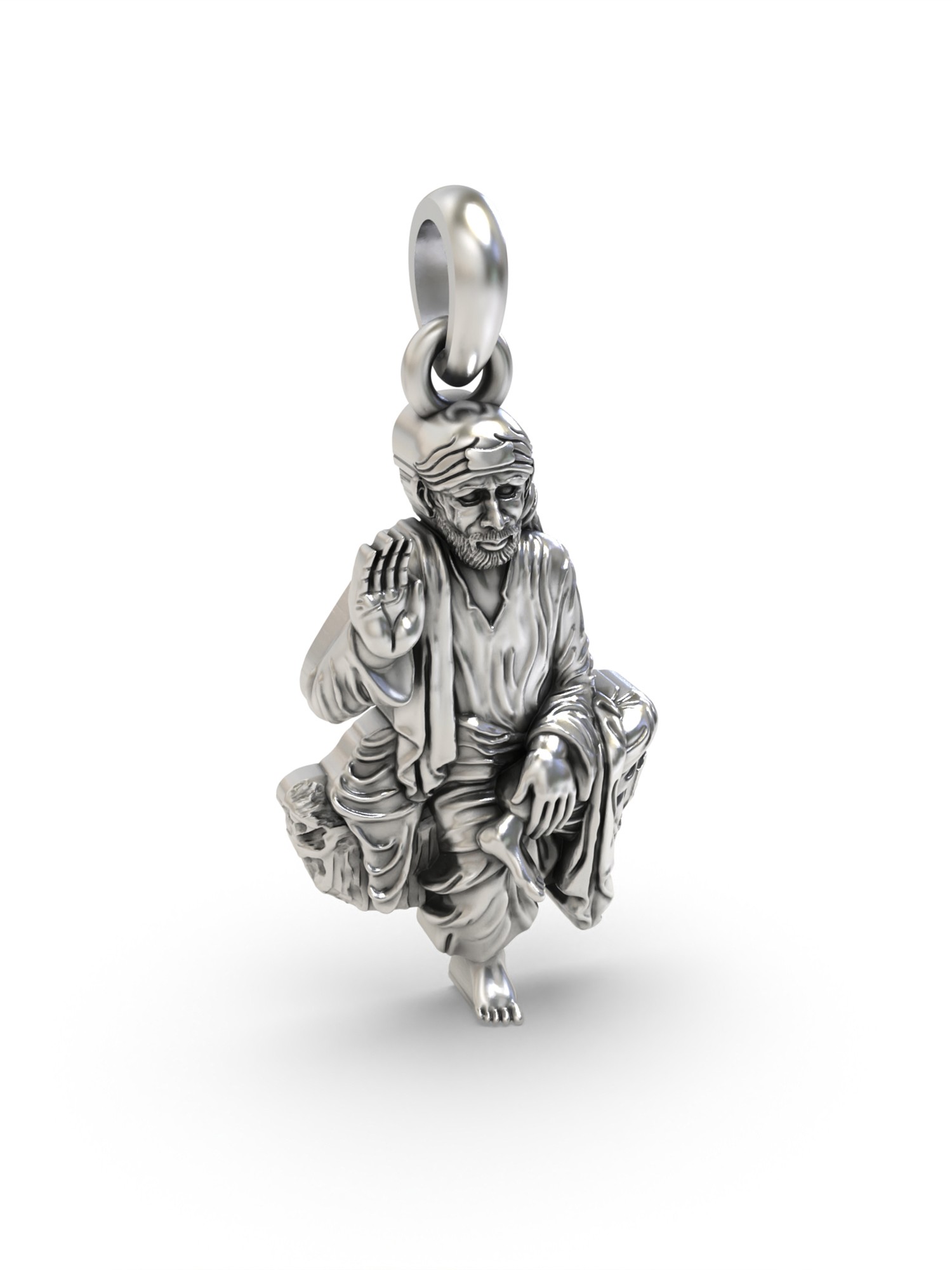 The artistry and detail of this pendant are truly remarkable. Crafted from sterling silver, the pendant boasts a stunning likeness of Shirdi Sai Baba in a seated, meditative pose. Every detail, from the folds of his clothing to the expression on his face, has been meticulously captured, resulting in a piece that's as beautiful as it is meaningful. The high-quality sterling silver ensures lasting shine and durability, making this pendant a treasured piece for years to come. Its small size allows for comfortable, everyday wear.