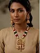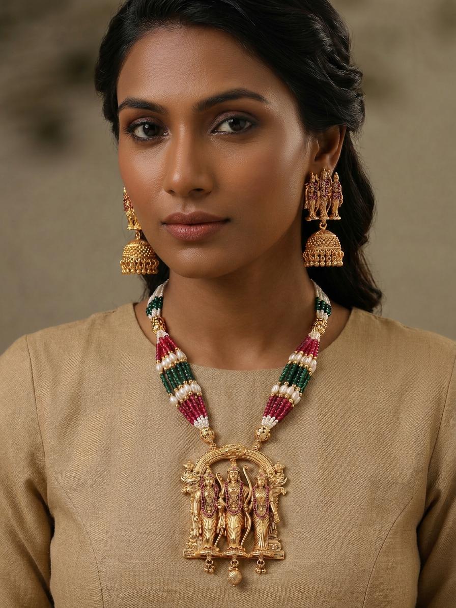 Experience the timeless elegance and spiritual significance of this exquisite Ram Darbar necklace set. Crafted with meticulous detail, this piece is more than just jewelry; it's a statement of faith and refined style. The centerpiece features a beautifully rendered depiction of Lord Ram, Sita, Lakshmana, and Hanuman, intricately sculpted and adorned with sparkling stones. The rich golden tones of the brass are complemented by vibrant red and green beads, creating a captivating visual harmony. This necklace is a perfect blend of traditional artistry and contemporary design, making it a versatile piece for both casual and formal occasions. The attention to detail is evident in every aspect, from the delicate beadwork to the finely crafted pendant. This necklace is designed to be a cherished heirloom, passed down through generations.