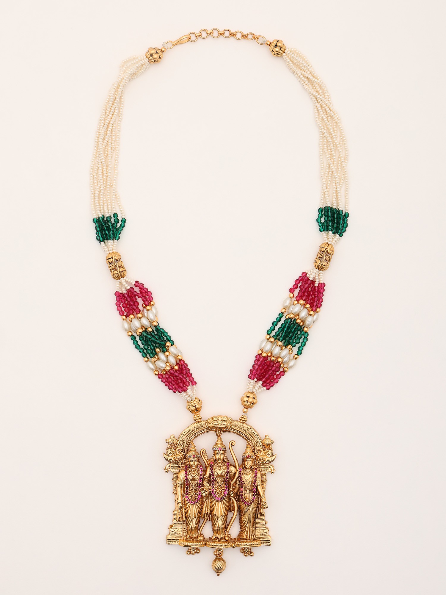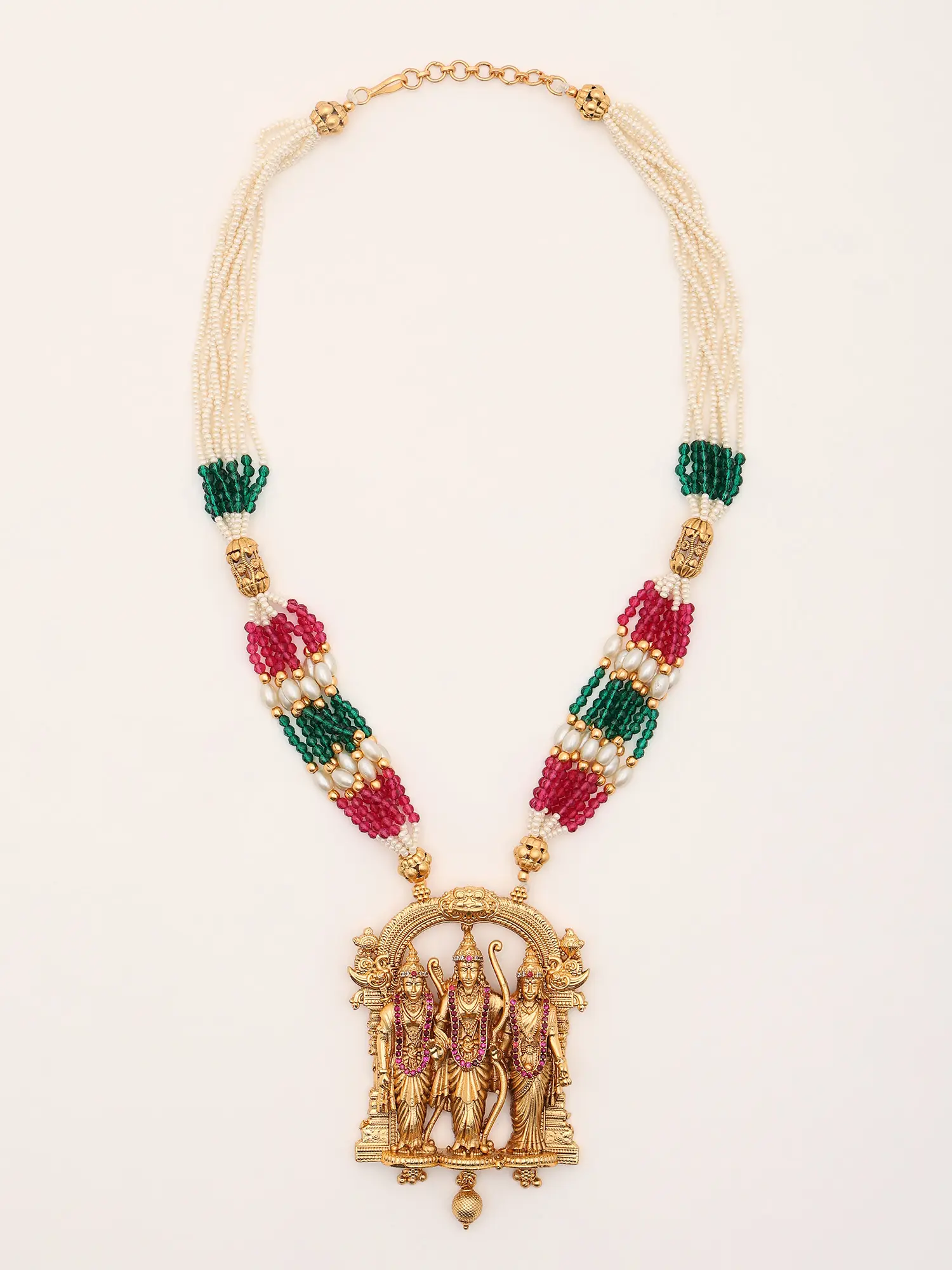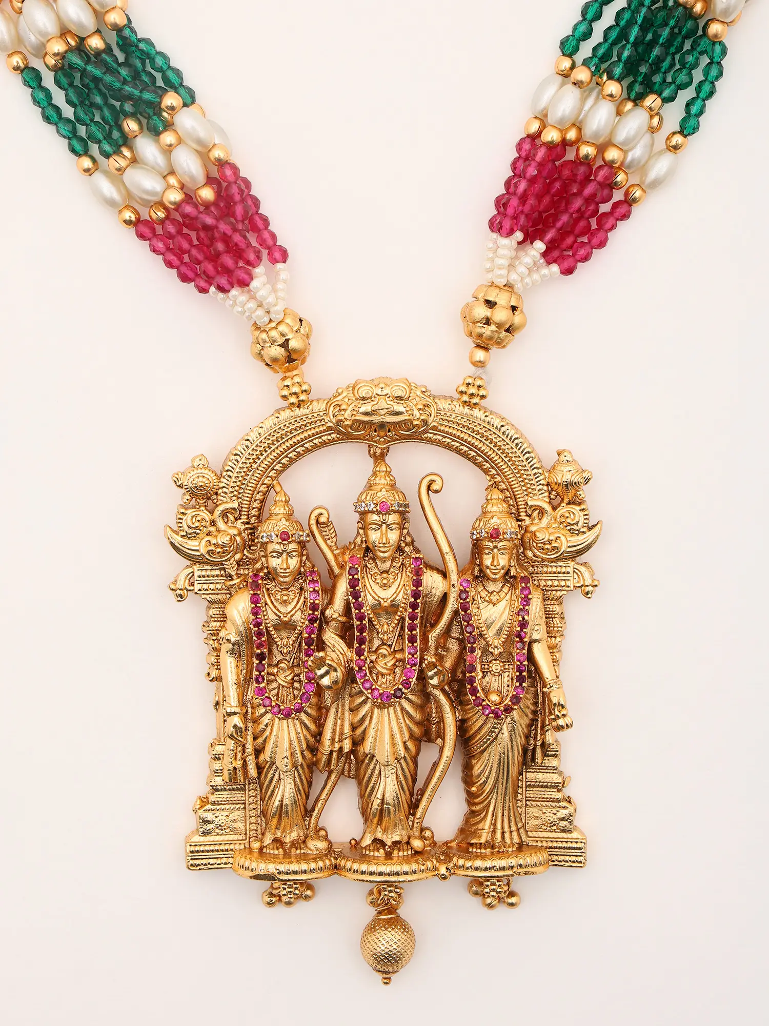 Multi Stone Studded Floral Design Necklace and Earrings Set with Five Strand