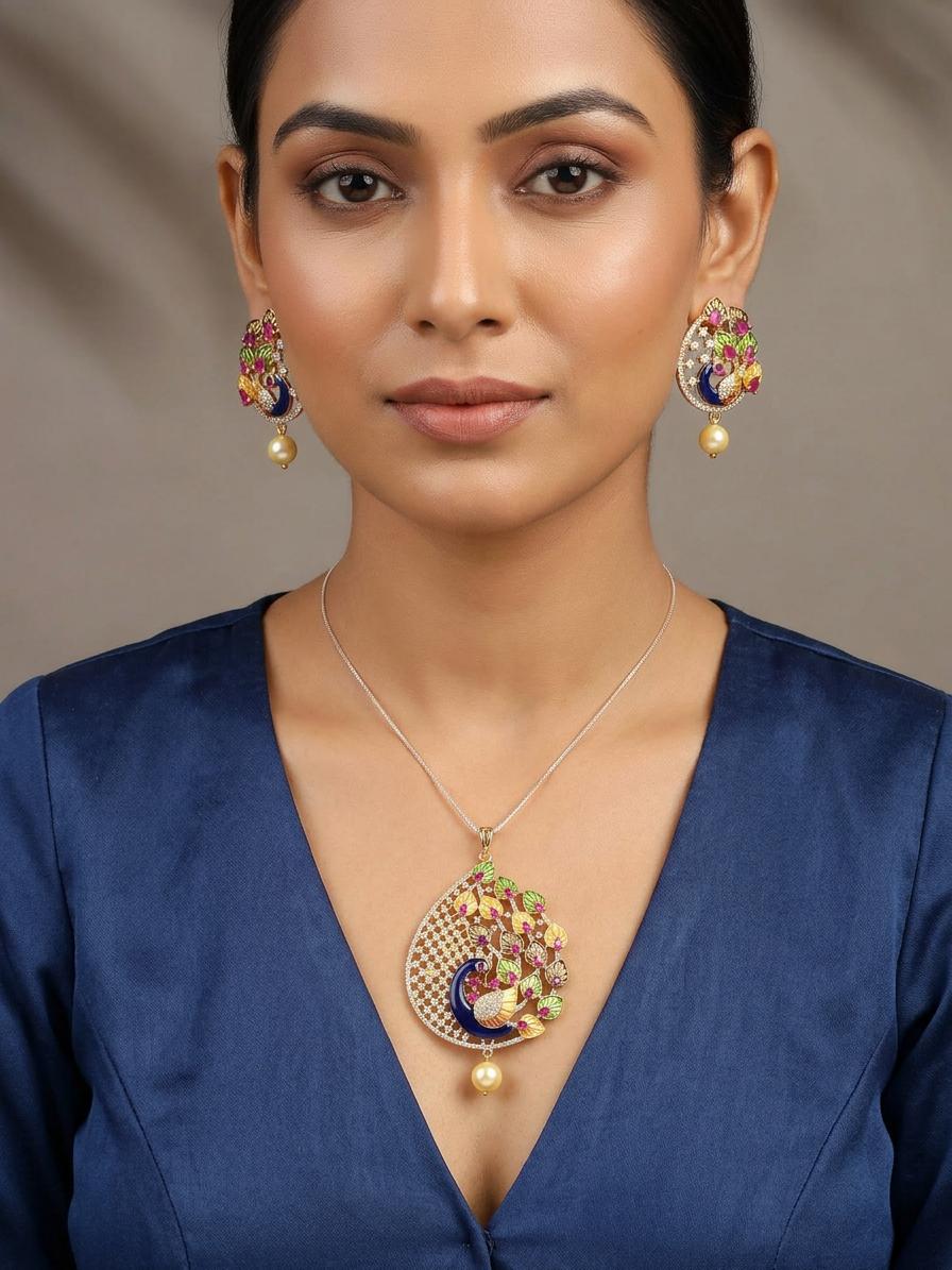 Designer Peacock Pendant and Earrings Set with Cubic Zirconia
