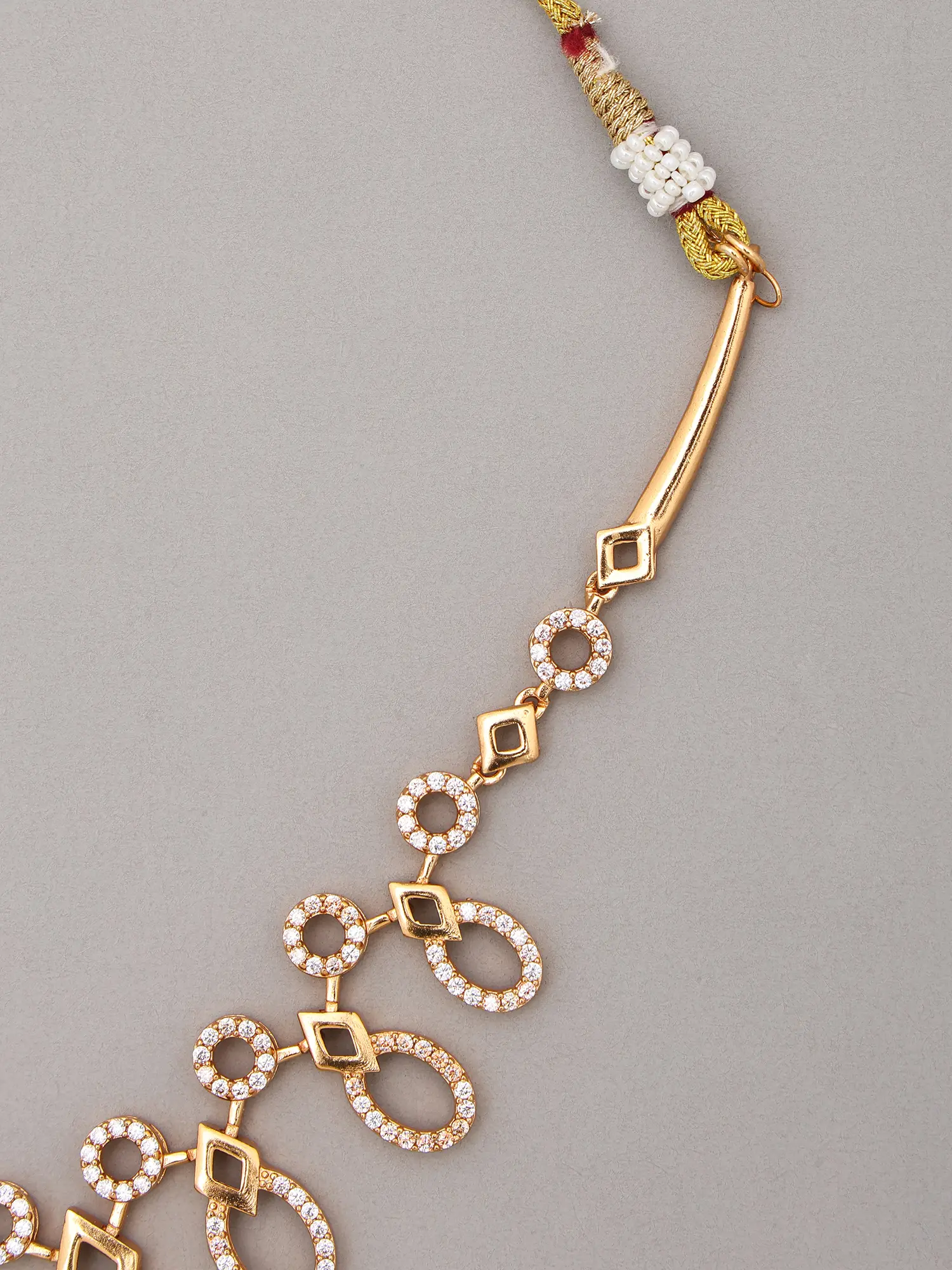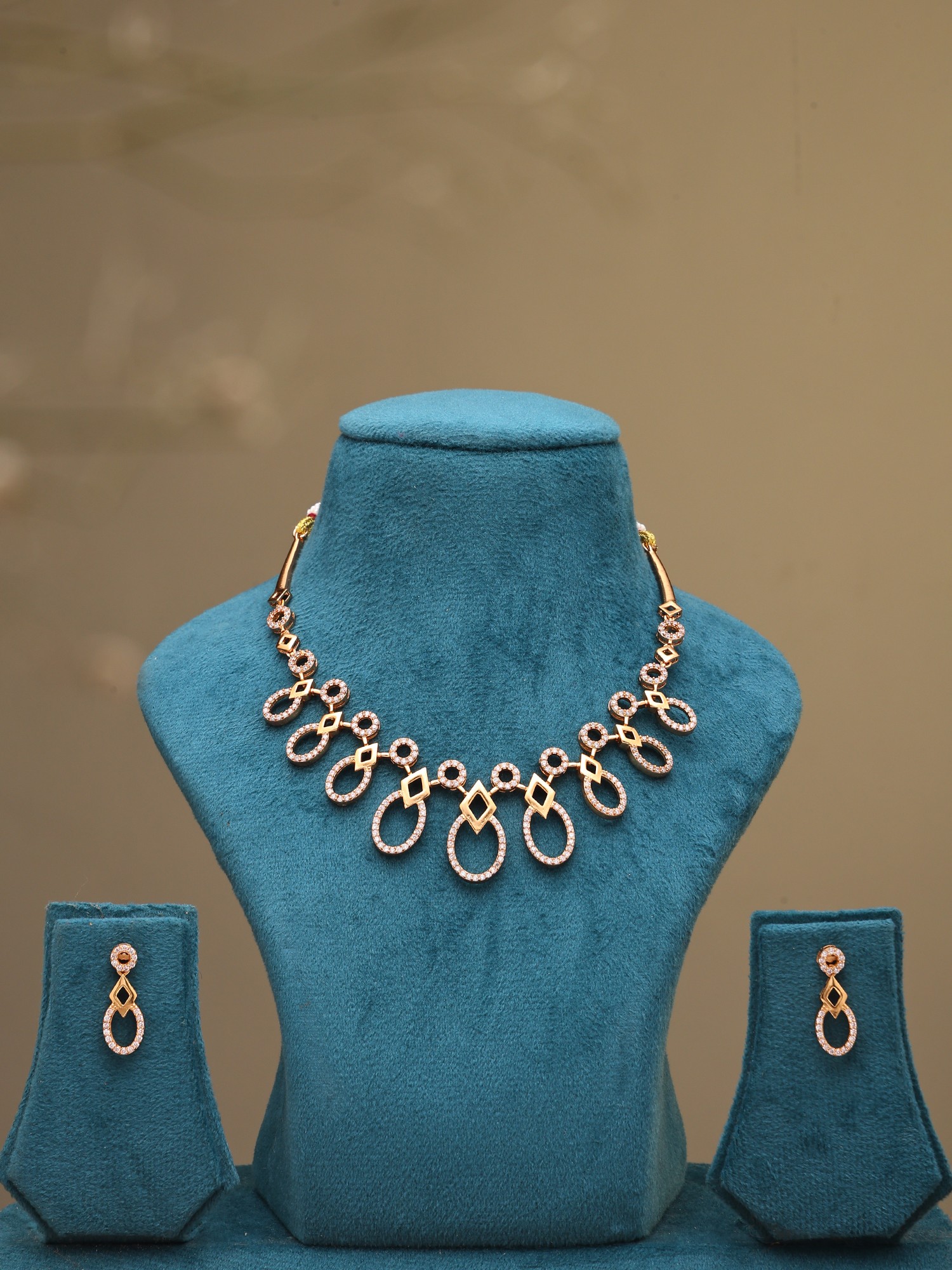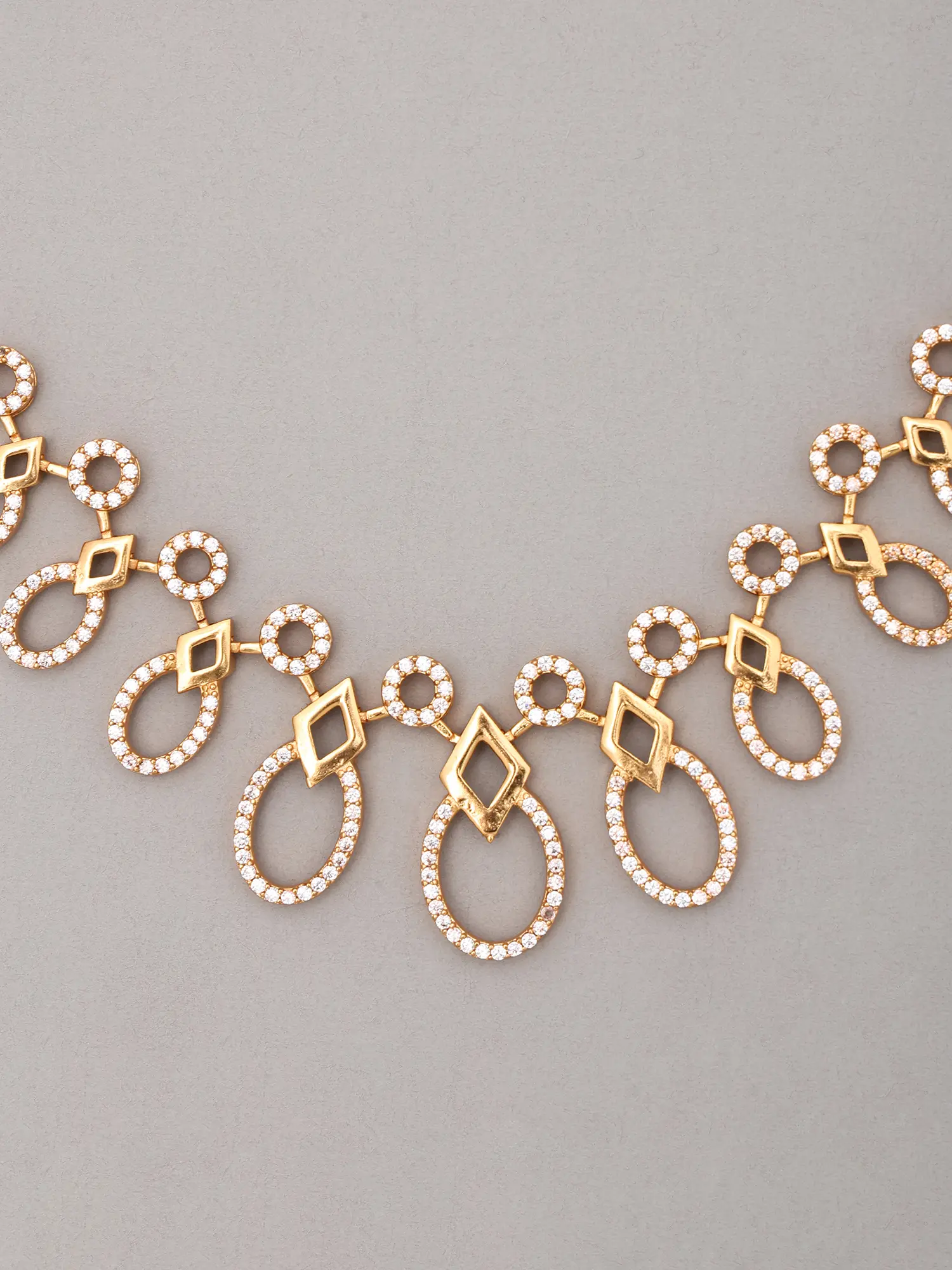 The necklace gracefully drapes, featuring a commanding central pendant with a 5.45-inch height that draws the eye with its balanced geometric pattern. This design is echoed in the perfectly proportioned earrings, each measuring a delicate 0.95 inches in height and 0.30 inches in width. The arrangement of interlocking shapes and the inclusion of sparkling stones create a harmonious visual flow, imbuing the piece with a modern yet timeless appeal.
