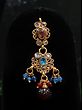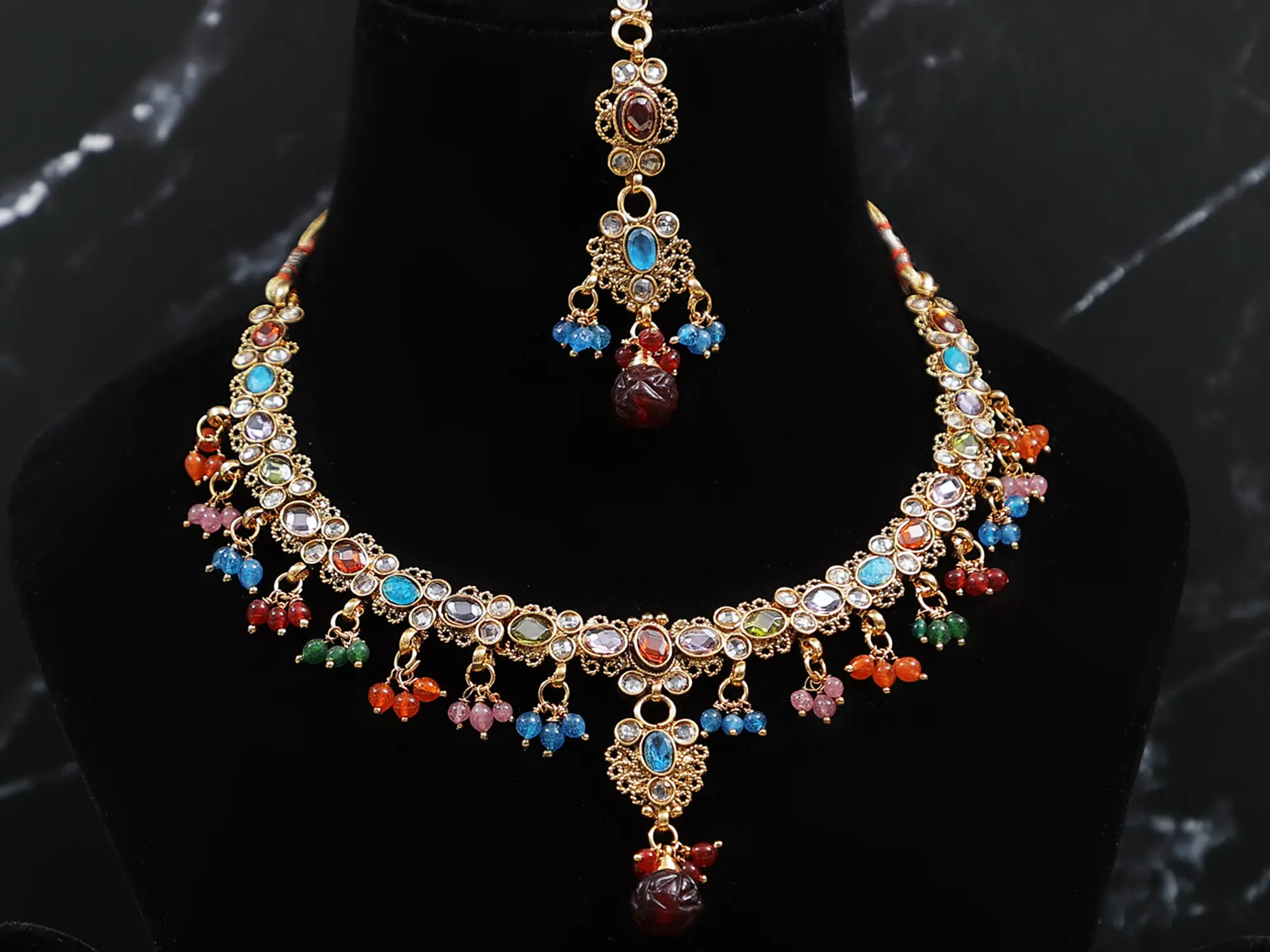 The matching earrings mirror the necklace's vibrant color palette and intricate details. They boast the same beautiful stones and gold detailing, creating a cohesive and harmonious look. These earrings are designed to hang delicately from your ears, adding a touch of elegance and sparkle to your overall ensemble. The maang tikka, a traditional Indian forehead ornament, completes the set perfectly. It features the same design elements as the necklace and earrings, further enhancing the overall look.