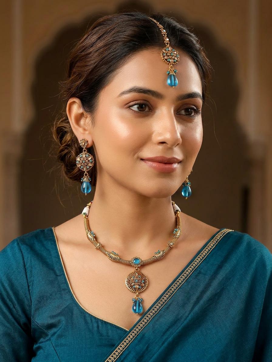 Dazzle in elegance with our stone-studded fashion necklace set. This beautiful necklace features carefully placed stones that create a captivating and glamorous design. The necklace, adorned with studded stones, adds a touch of opulence to the neckline. The set includes coordinating earrings, completing your look with a harmonious and stylish flair.