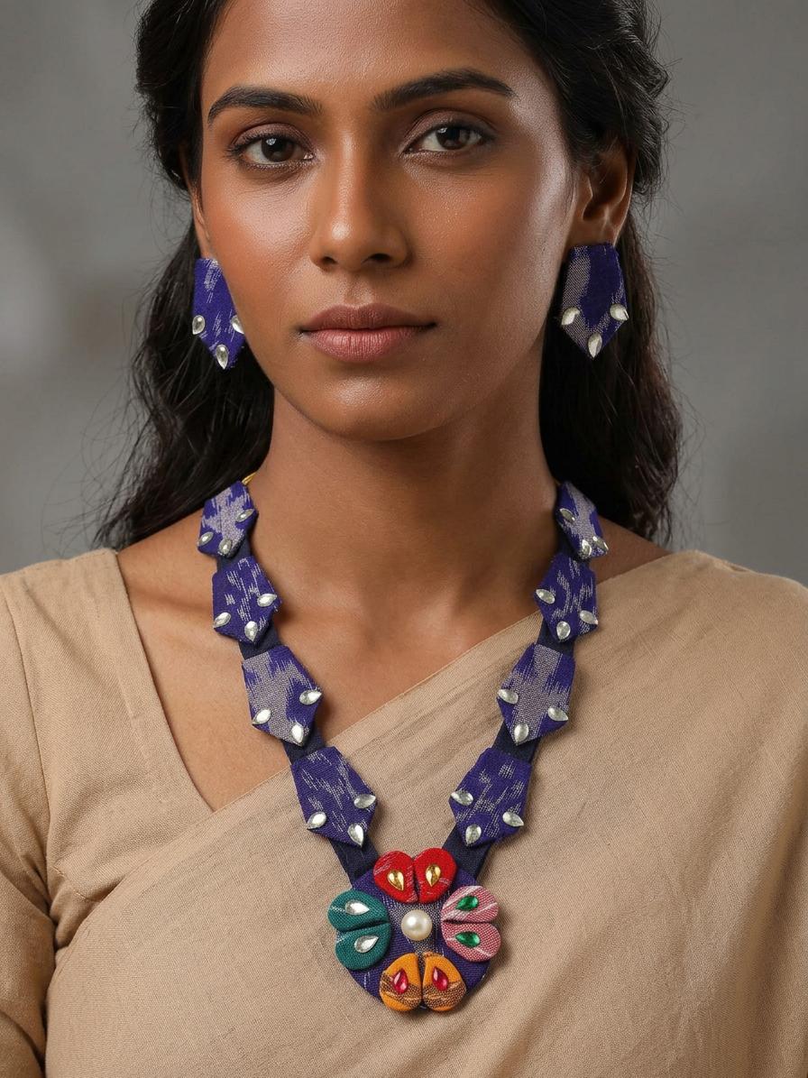 Embrace the vibrant spirit of India with this exquisite necklace and earrings set, a masterpiece of Sambalpuri handloom artistry. This stunning piece seamlessly blends traditional craftsmanship with contemporary design, creating a statement jewelry set that is both unique and unforgettable. The rich, deep blue of the Sambalpuri fabric provides a captivating backdrop for the meticulously placed stone accents and vibrant floral embellishments. Each piece is handcrafted with care, ensuring a level of quality and detail that elevates this set beyond mere adornment.