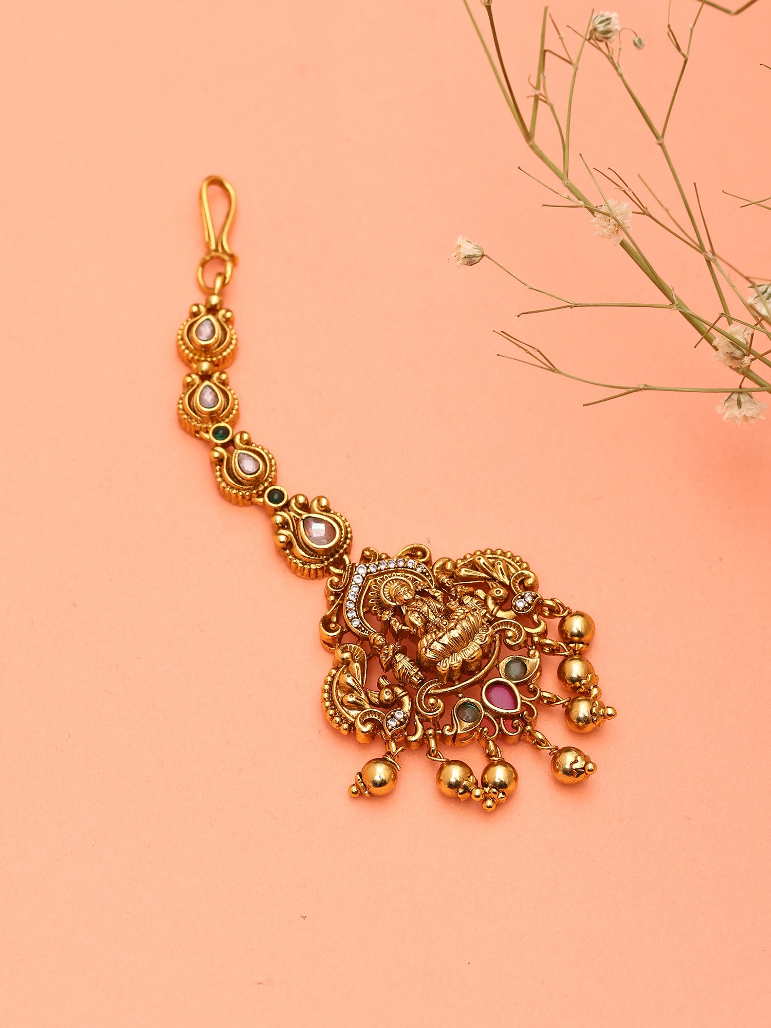 Temple-Style Goddess Lakshmi Maang Tikka with Pearl Drops