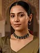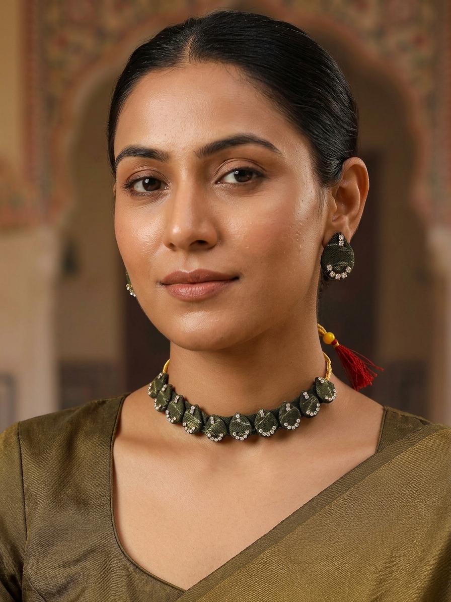 This exquisite choker and earring set is a testament to the artistry of Indian handloom weaving. Crafted with meticulously selected Sambalpuri fabric and finished with gleaming MDF accents, this piece effortlessly blends traditional craftsmanship with modern sophistication. The rich, deep olive green of the fabric provides a stunning backdrop for the delicately placed sparkling stones, creating a captivating contrast that's sure to draw compliments. The stones themselves are carefully chosen and precisely set, catching the light with every movement, adding a touch of sparkle and glamour to your ensemble. The understated elegance of this set makes it a versatile choice, perfect for a variety of occasions, from casual daytime wear to more formal evening events.