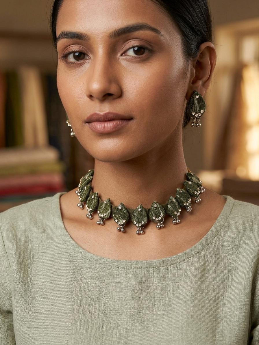 Stone Studded Floral Design Handloom Sambalpuri Fabric Necklace and Earrings Set