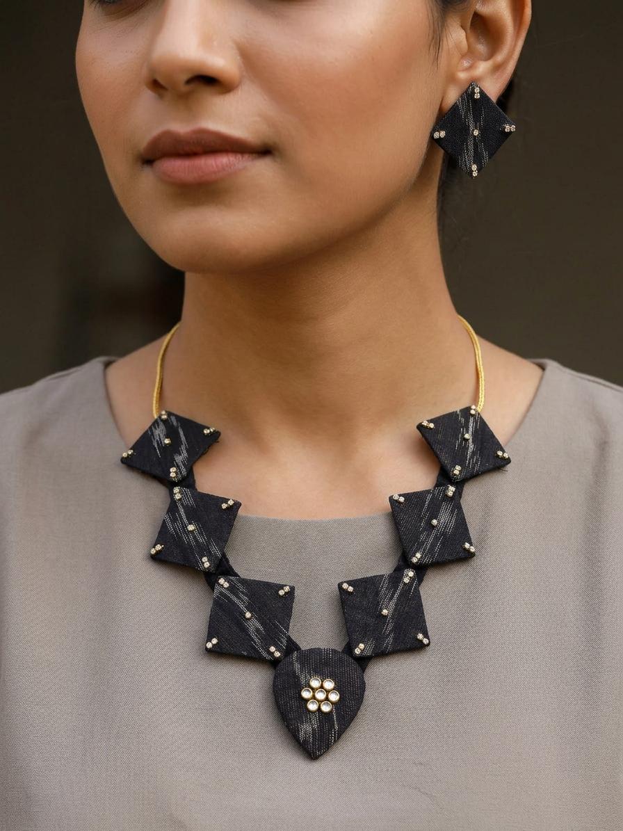 Black Handloom Sambalpuri Fabric Necklace Set with Earrings