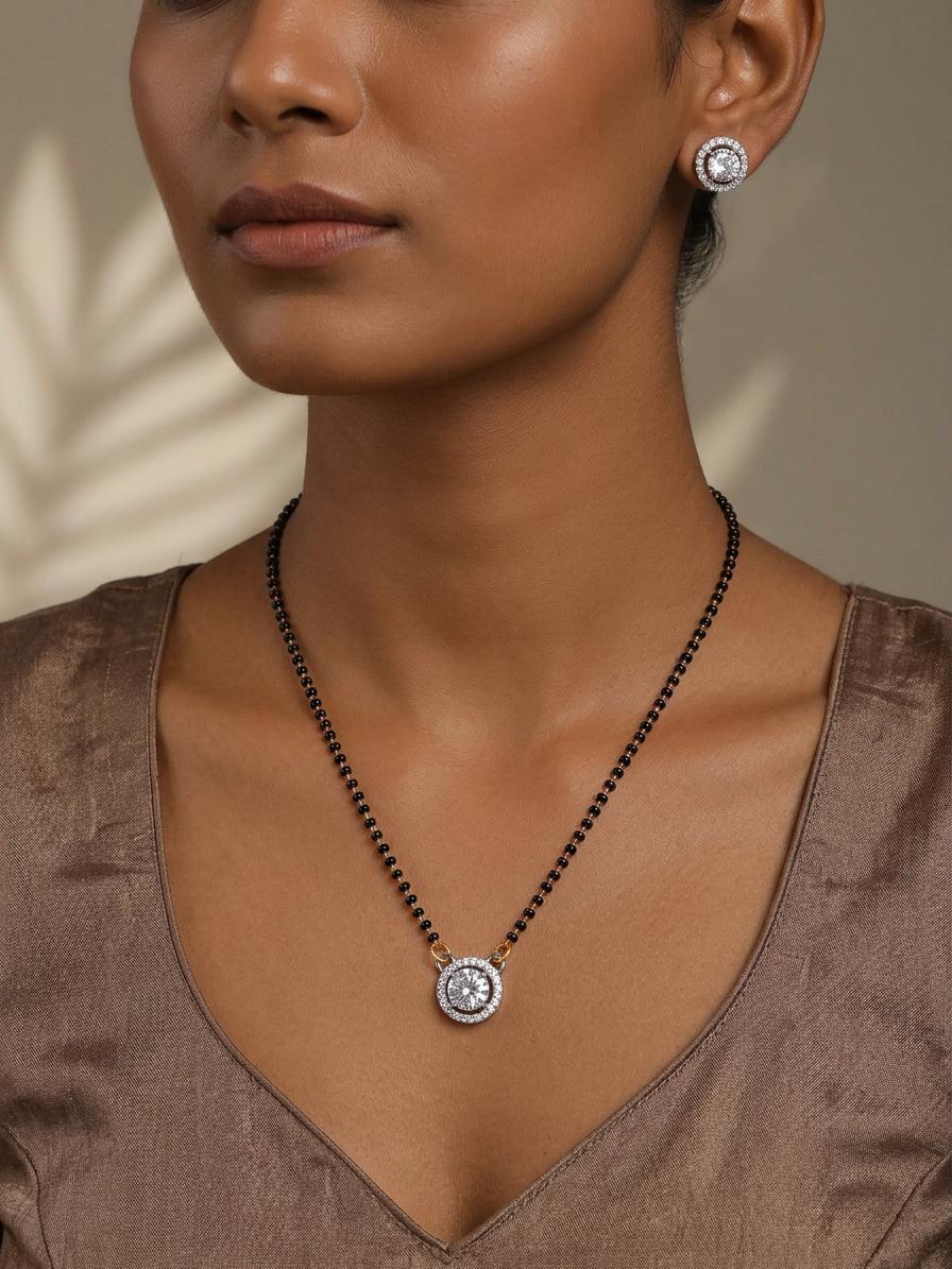 Celebrate your special bond with this exquisitely crafted jewelry set, designed to add a touch of sophistication to your everyday look. The delicate mangalsutra, a symbol of marital commitment, is reimagined with contemporary styling, making it a versatile piece you'll cherish for years to come. This set offers a perfect blend of tradition and modernity.