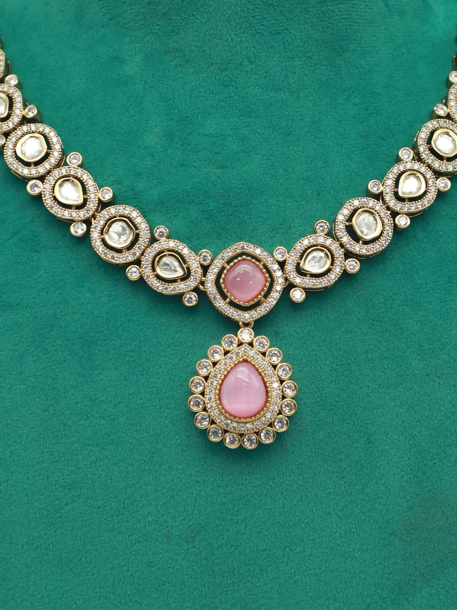 The necklace design includes an elegant pendant and intricate stone detailing.