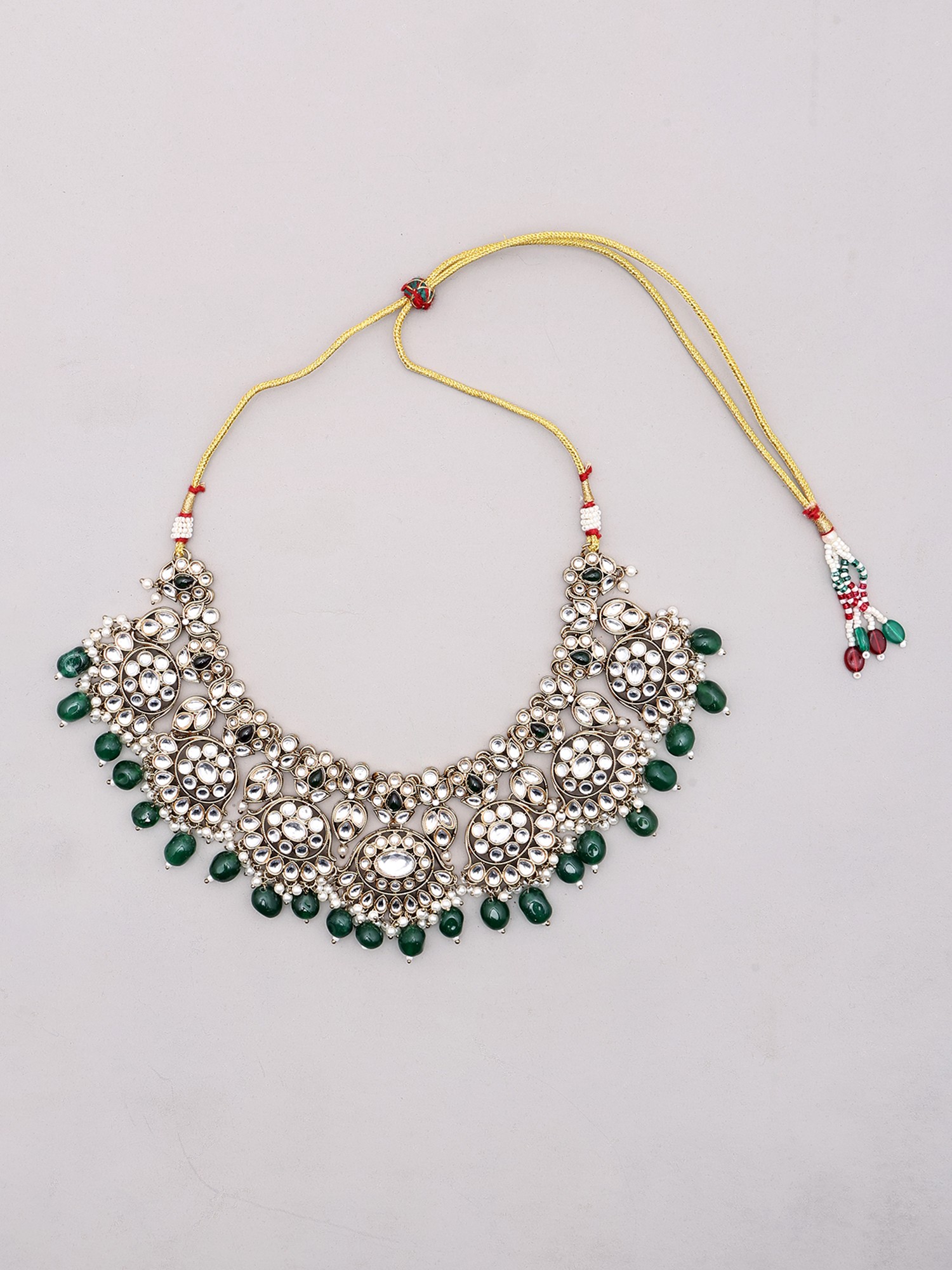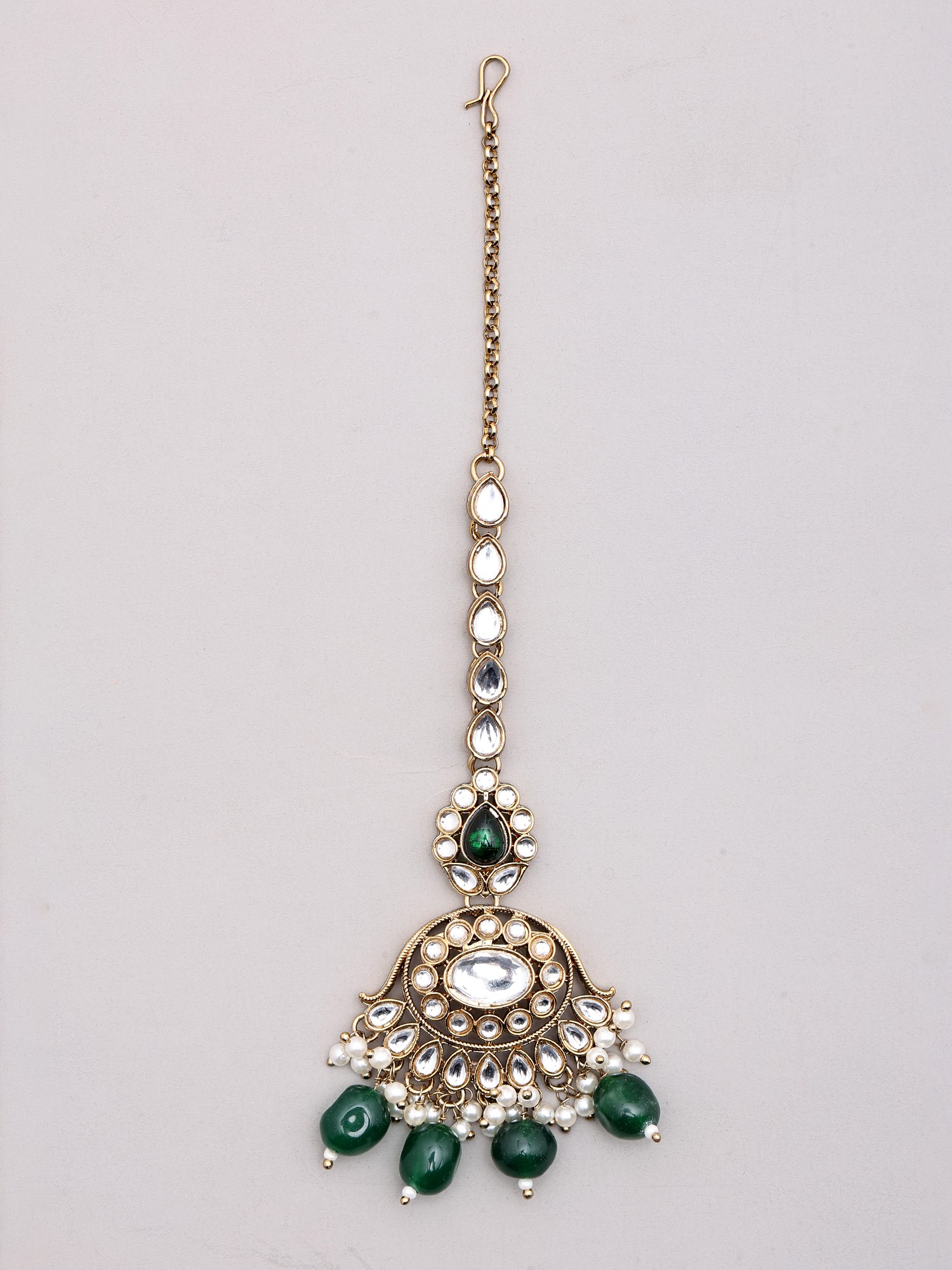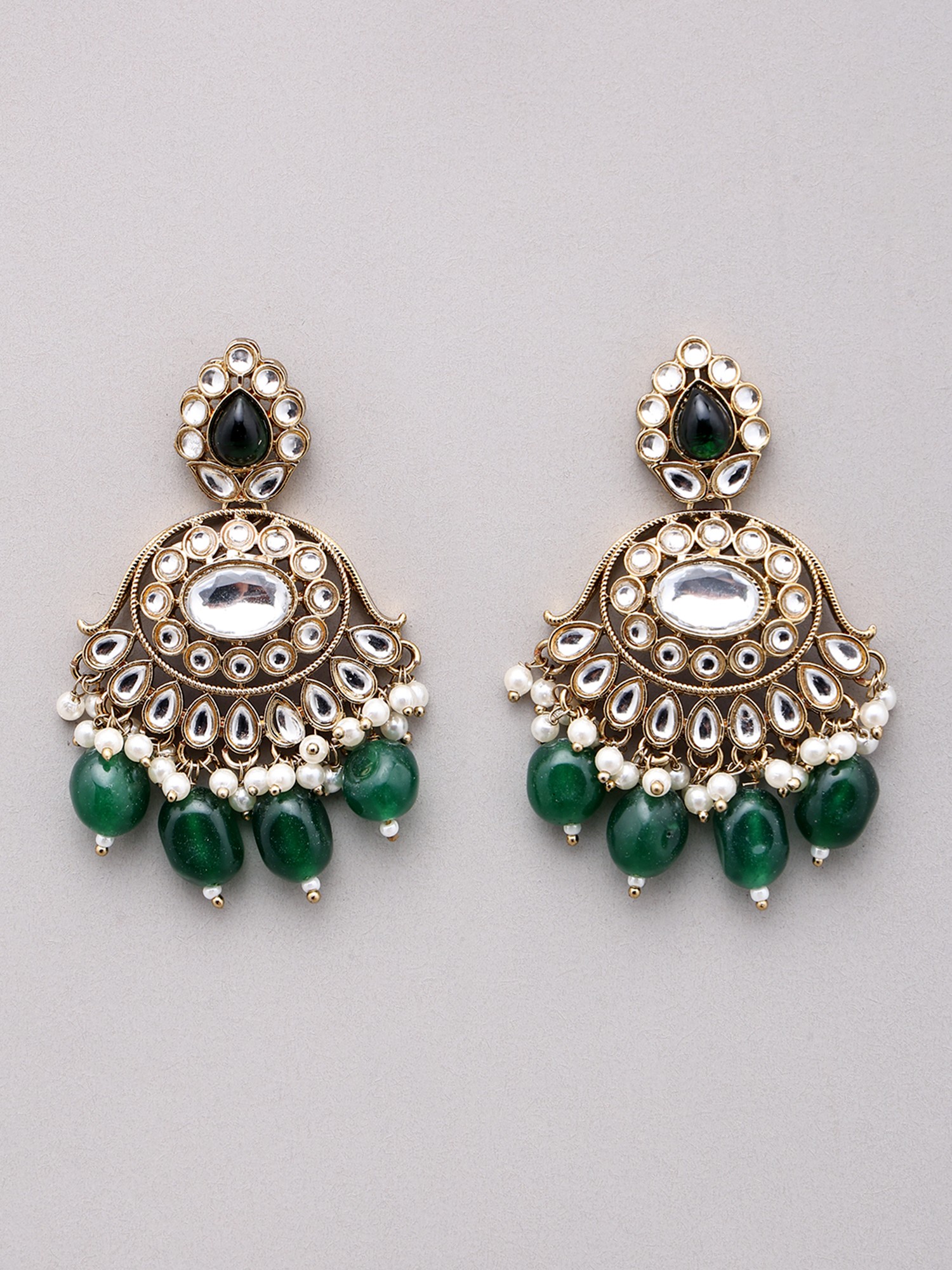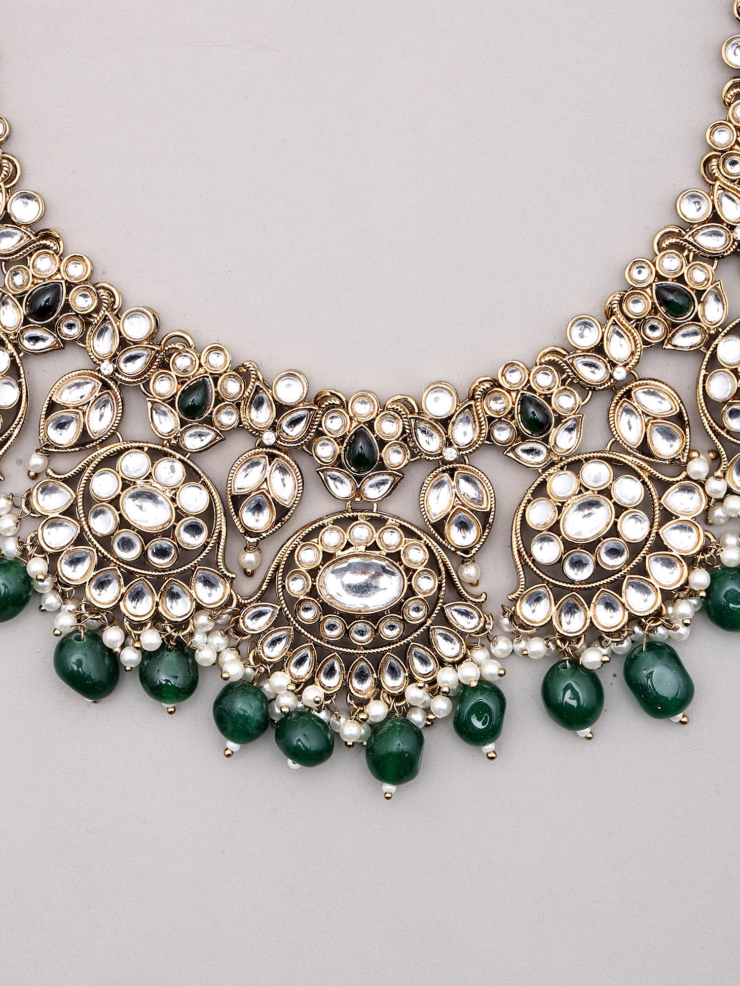 Stone and Kundan Studded Jewelry Set with Green Beads Drop